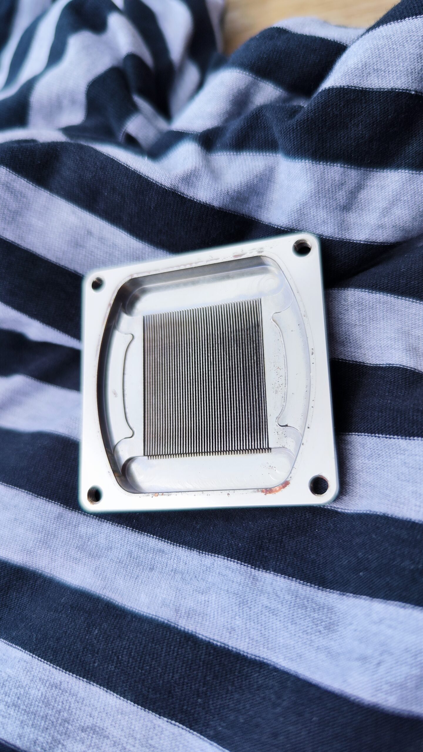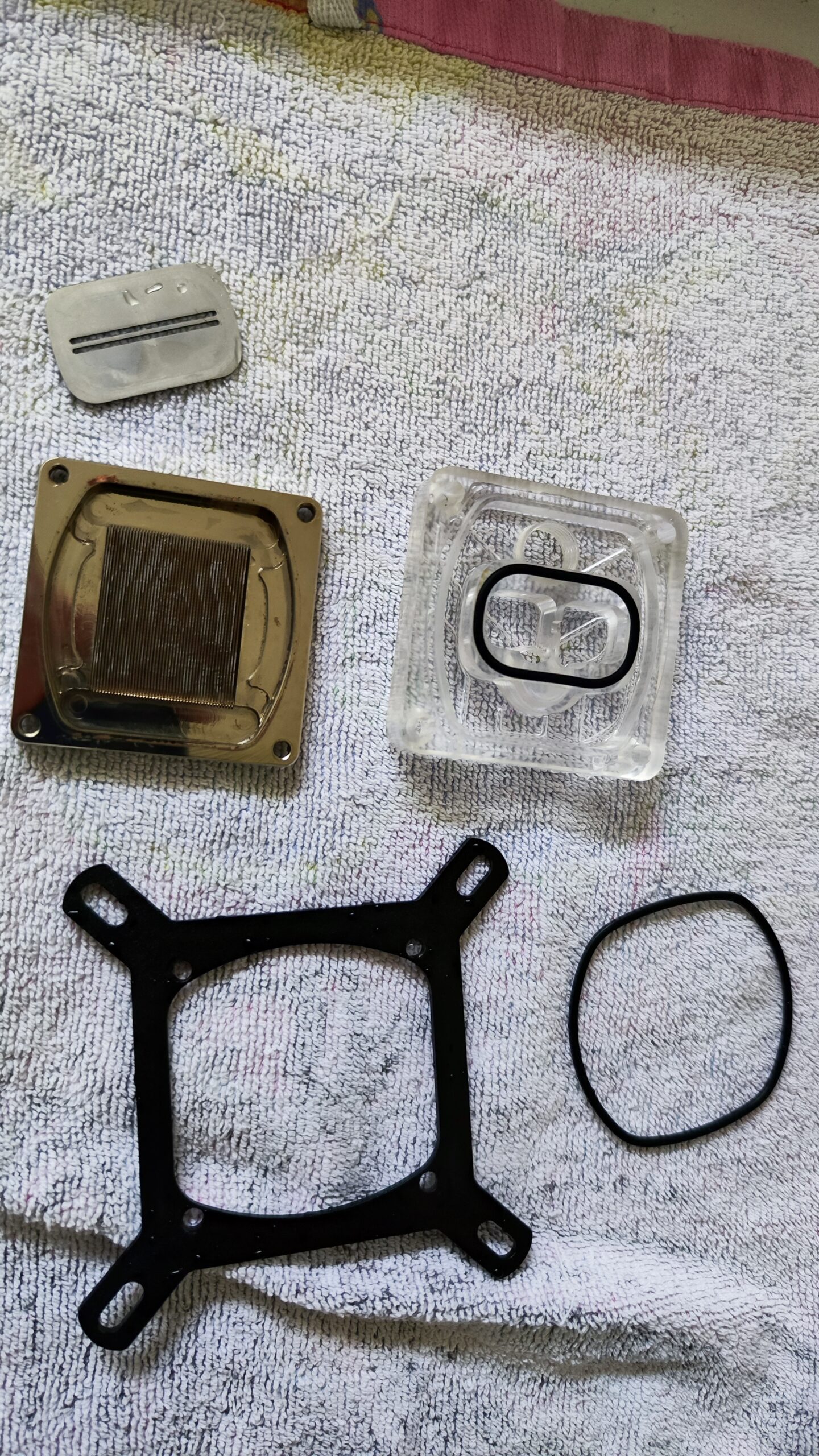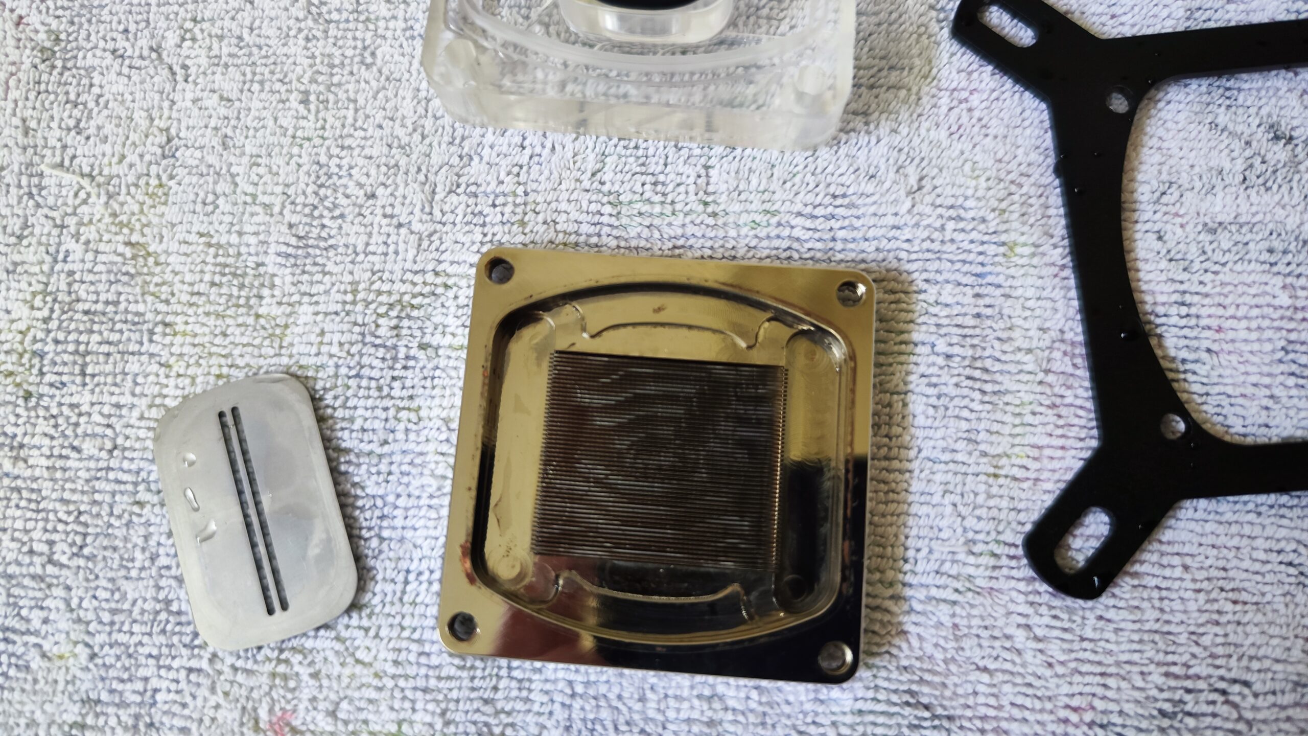 Som ni ser finns det spår av korrosion – eller snarare att nickellegeringen har släppt på vissa ställen. Vid ett tillfälle när jag skulle rengöra loopen använde jag en svag vinägerblandning (ca 2 cl på 5 liter destillerat vatten) som fick cirkulera över natten. Problemet var att blandningen trängde in under tätningsringarna, och jag var för långsam med att skölja ur loopen efteråt. Det är exakt samma typ av skada som GPU-blocket längre ner också har fått.