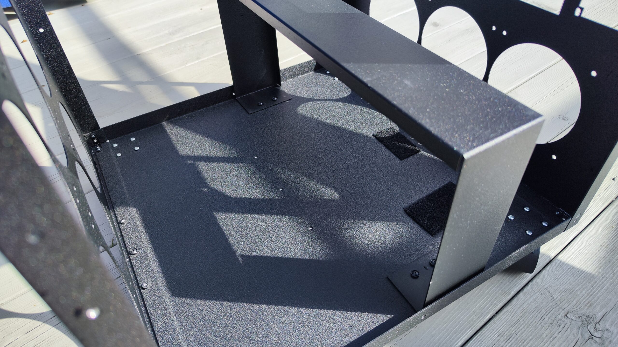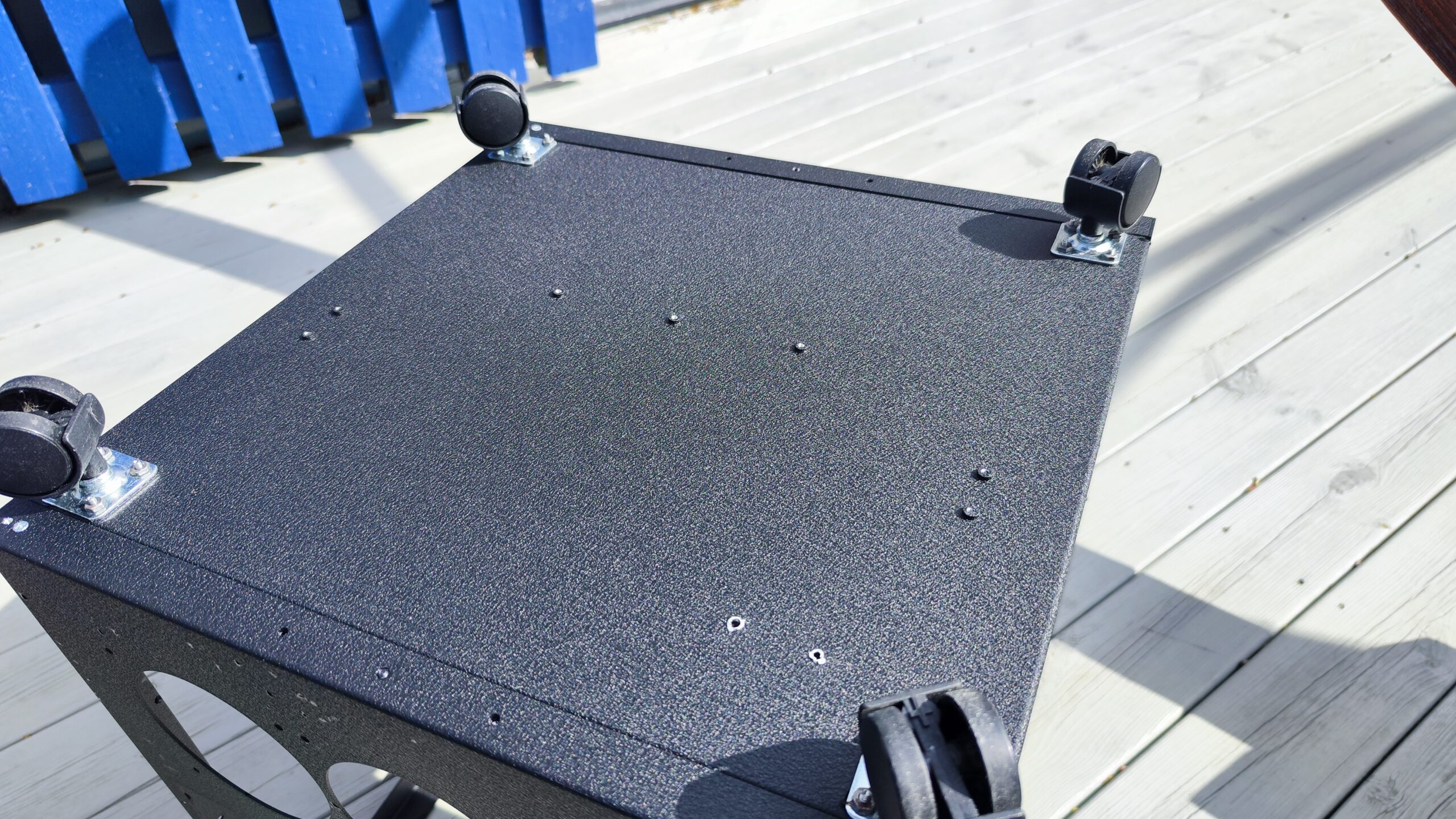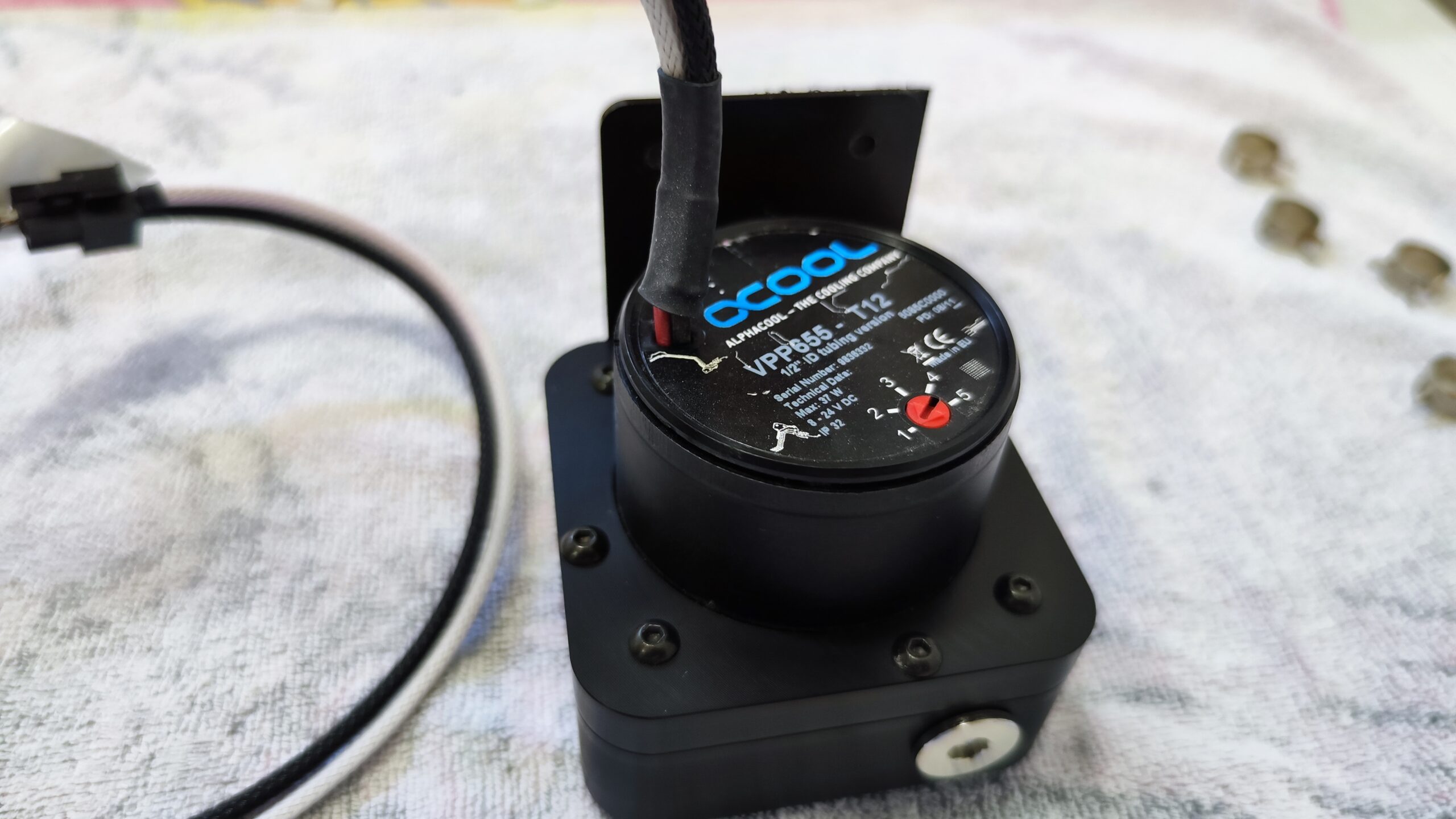 Pump: Jag var dum nog att borra två hål i botten på chassit för att fästa pumpen. Det fungerade inget vidare, eftersom vibrationer från pumpen utan dämpning hördes för mycket. Jag löste det genom att istället fästa pumpen med kardborreband – ena sidan är limmad i botten på chassit, och den andra sitter på pumpens fäste. Det fungerar perfekt: pumpen är lätt att ta loss för underhåll, och när den väl sitter på plats dämpas vibrationerna effektivt, vilket gör att den i princip är ljudlös.