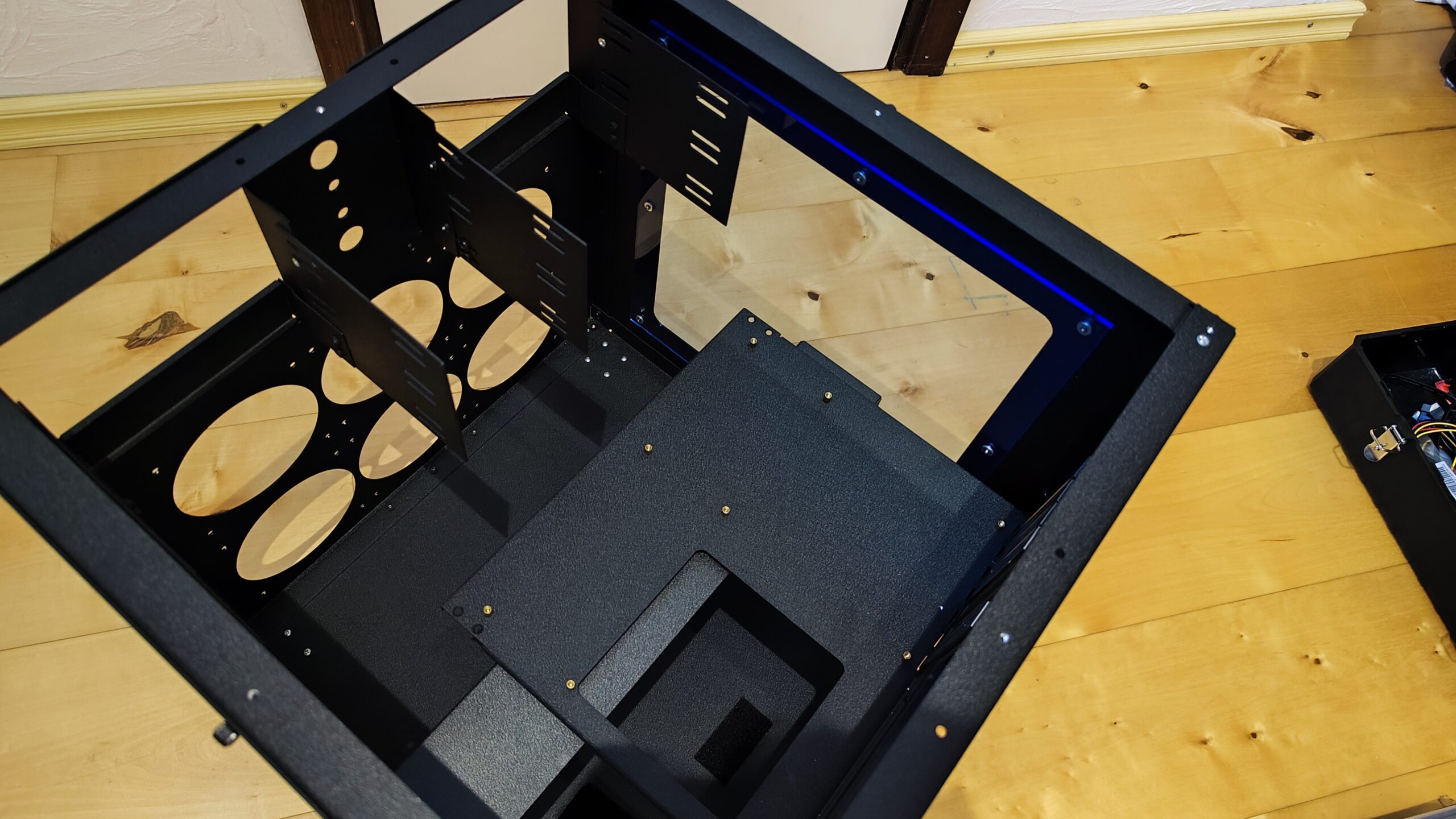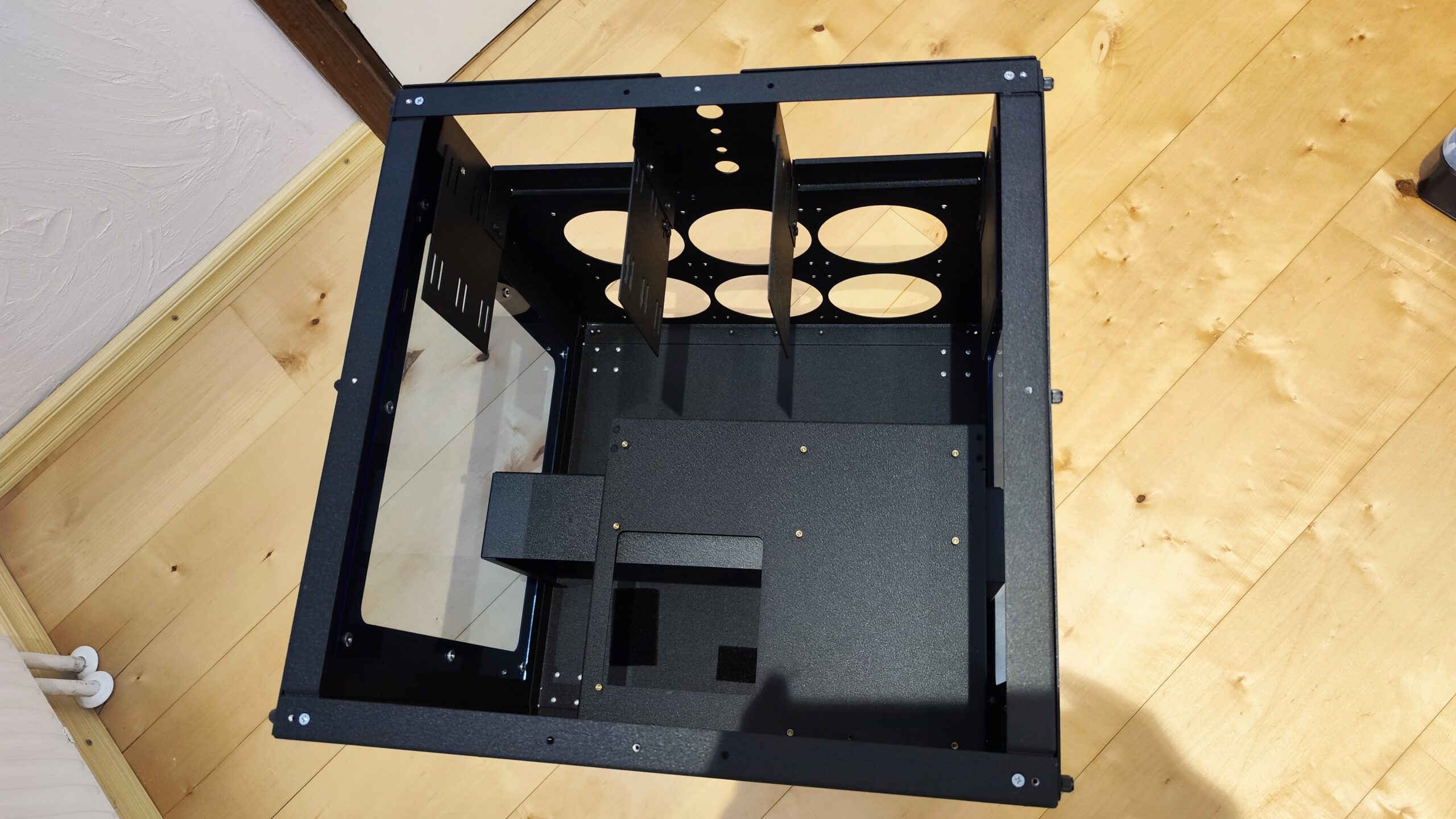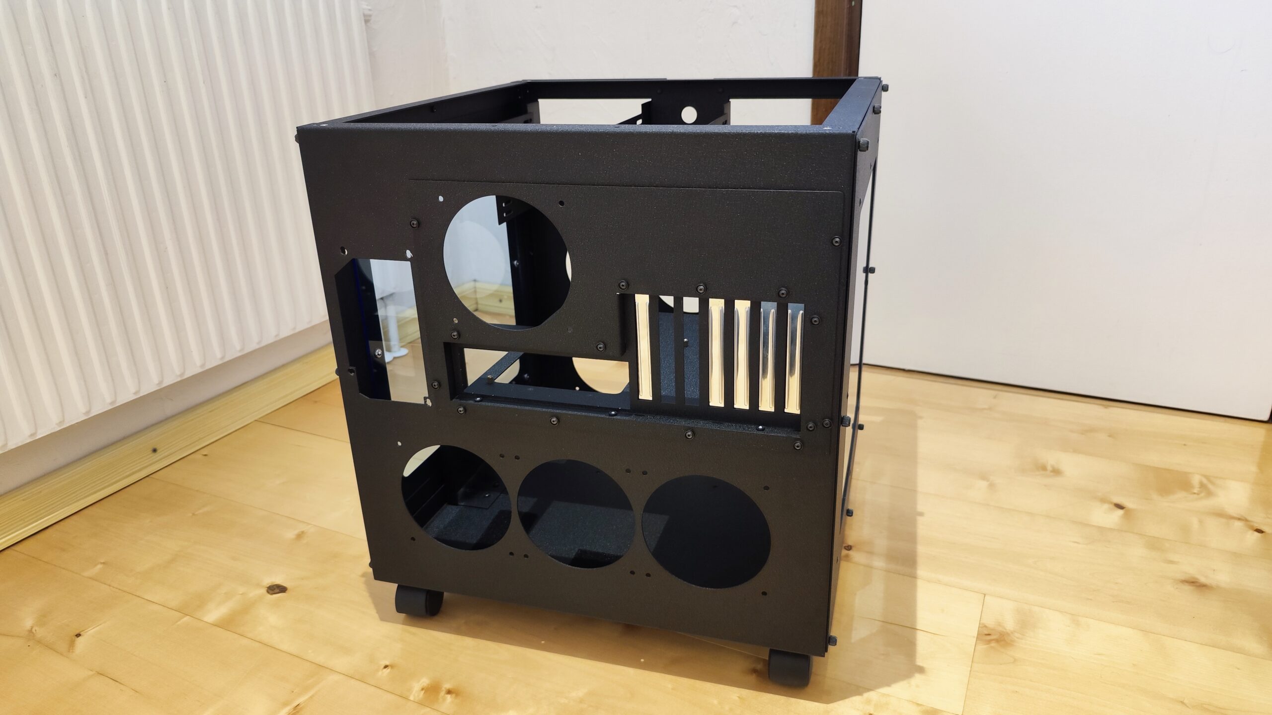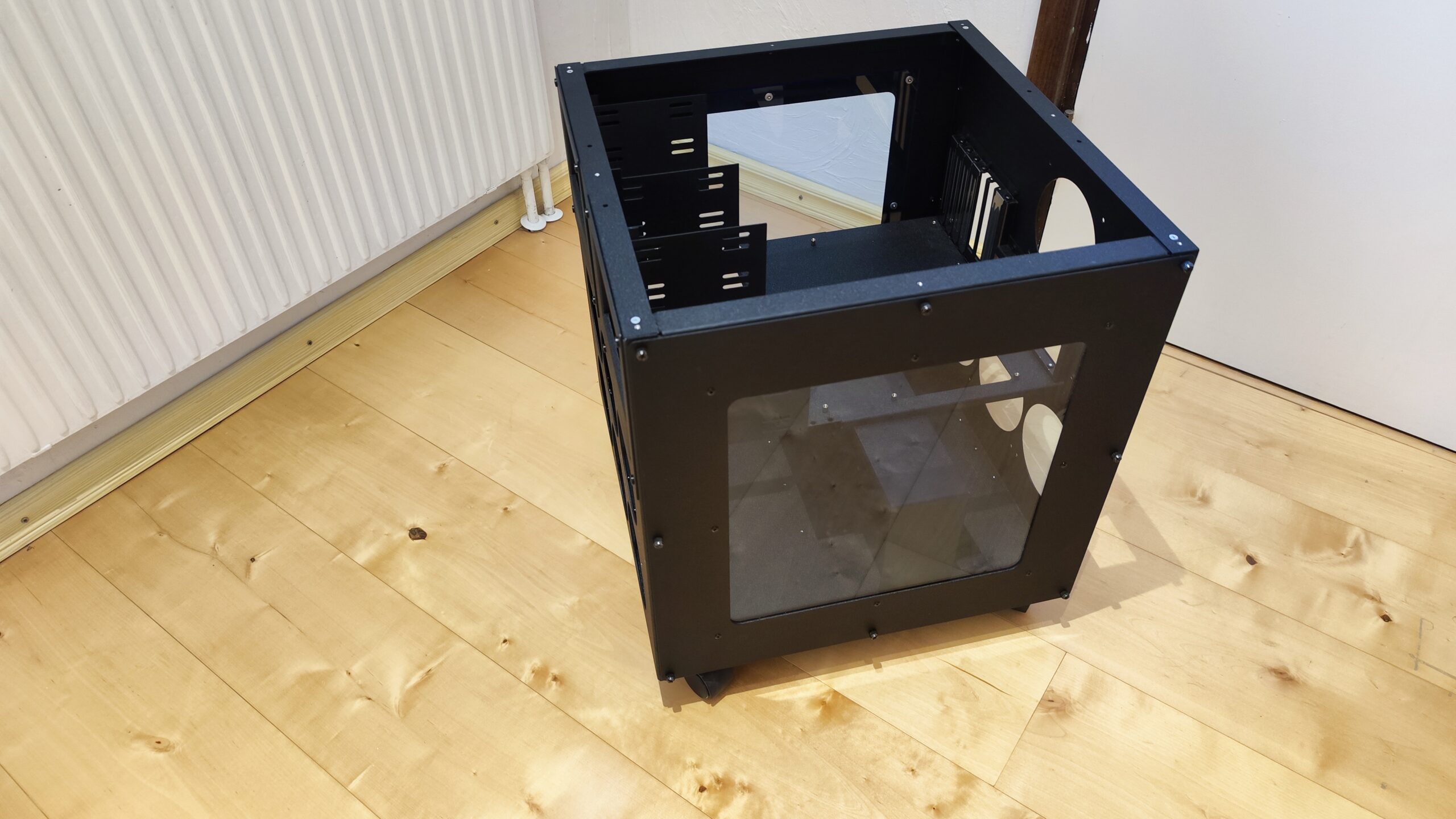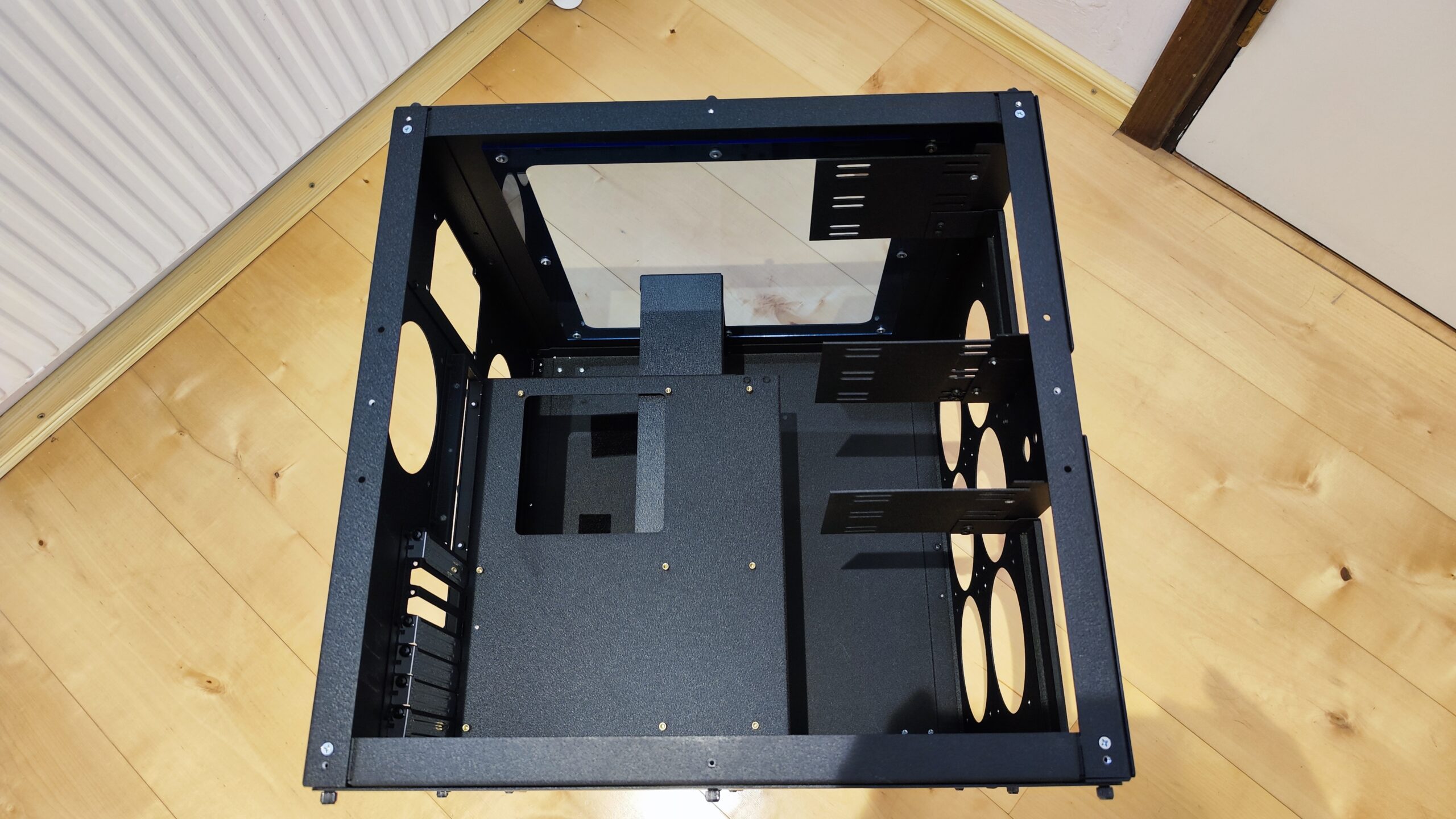 PSU: Jag skulle rekommendera en större PSU-modell för att den ska nå till den stödram som finns i mitten. Den senaste PSU jag använde var en mindre modell – det fungerade absolut, och chassit är superstabilt och klarar lätt att bära upp vikten även om den bara “hänger”. Men det blir helt enkelt snyggare och bättre med en längre PSU.