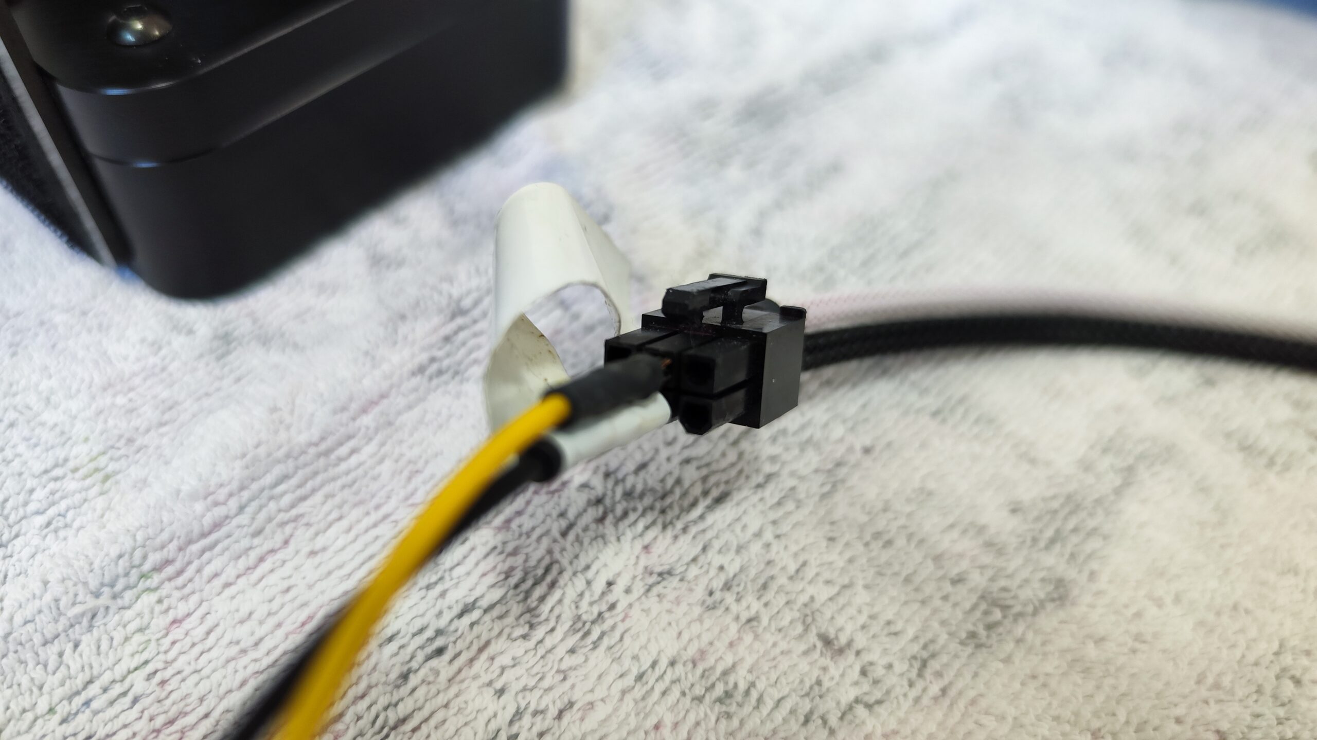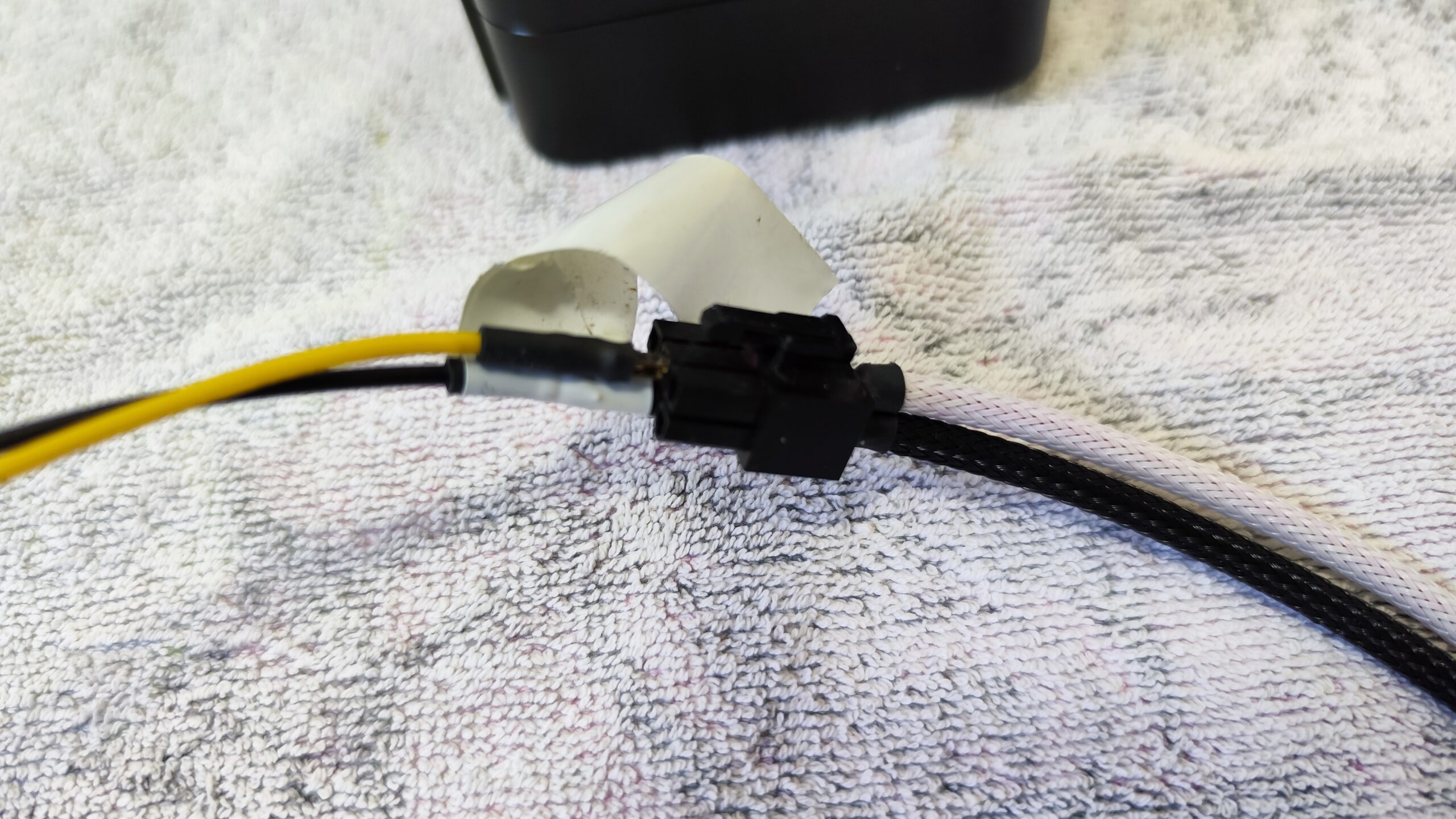 Observera: Elkopplingen behöver troligen göras om, då den sannolikt inte passar din PSU direkt. Kolla bilderna för referens: svart kabel till svart, vit kabel till gul (12V).
