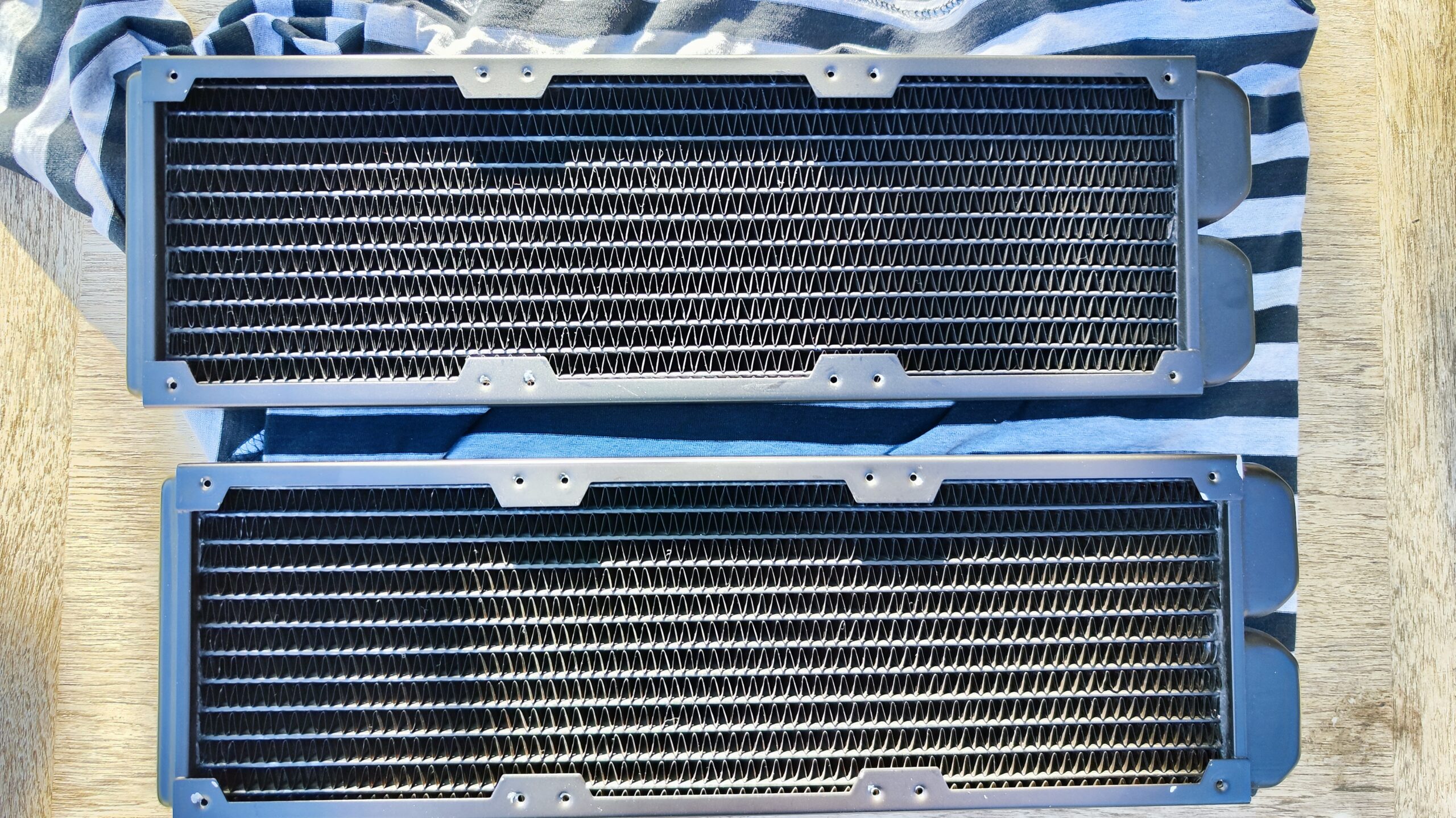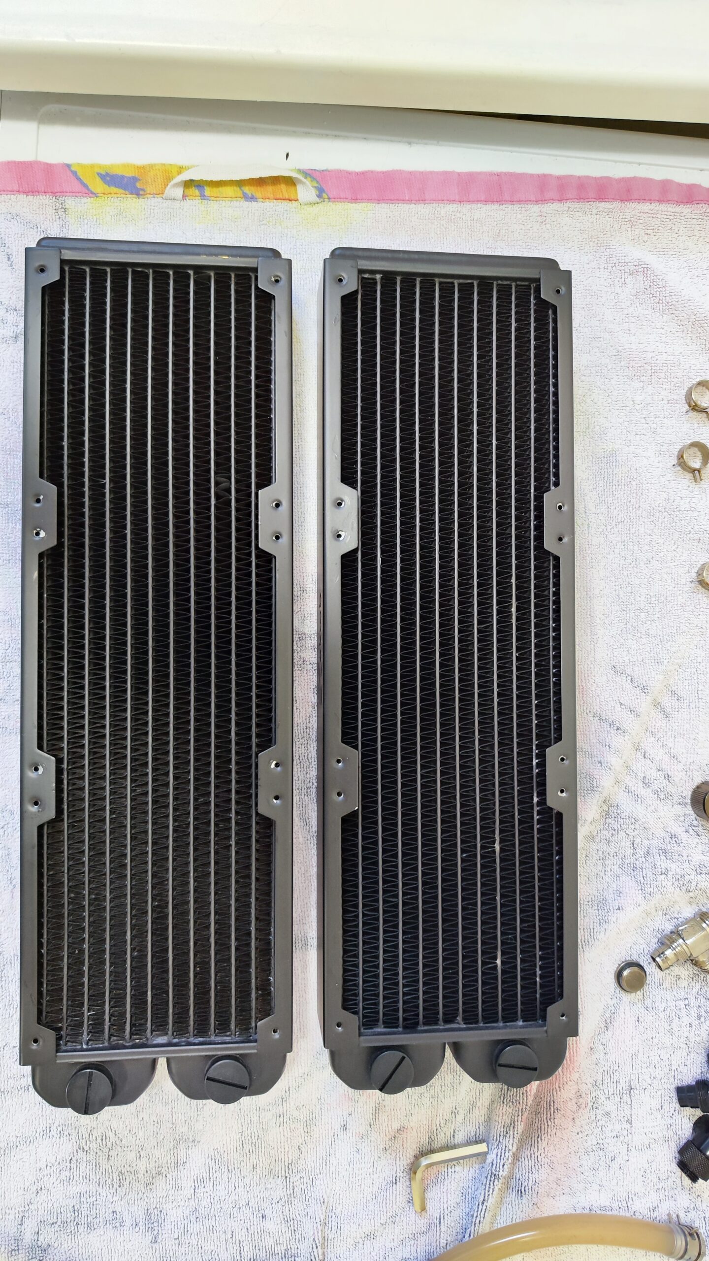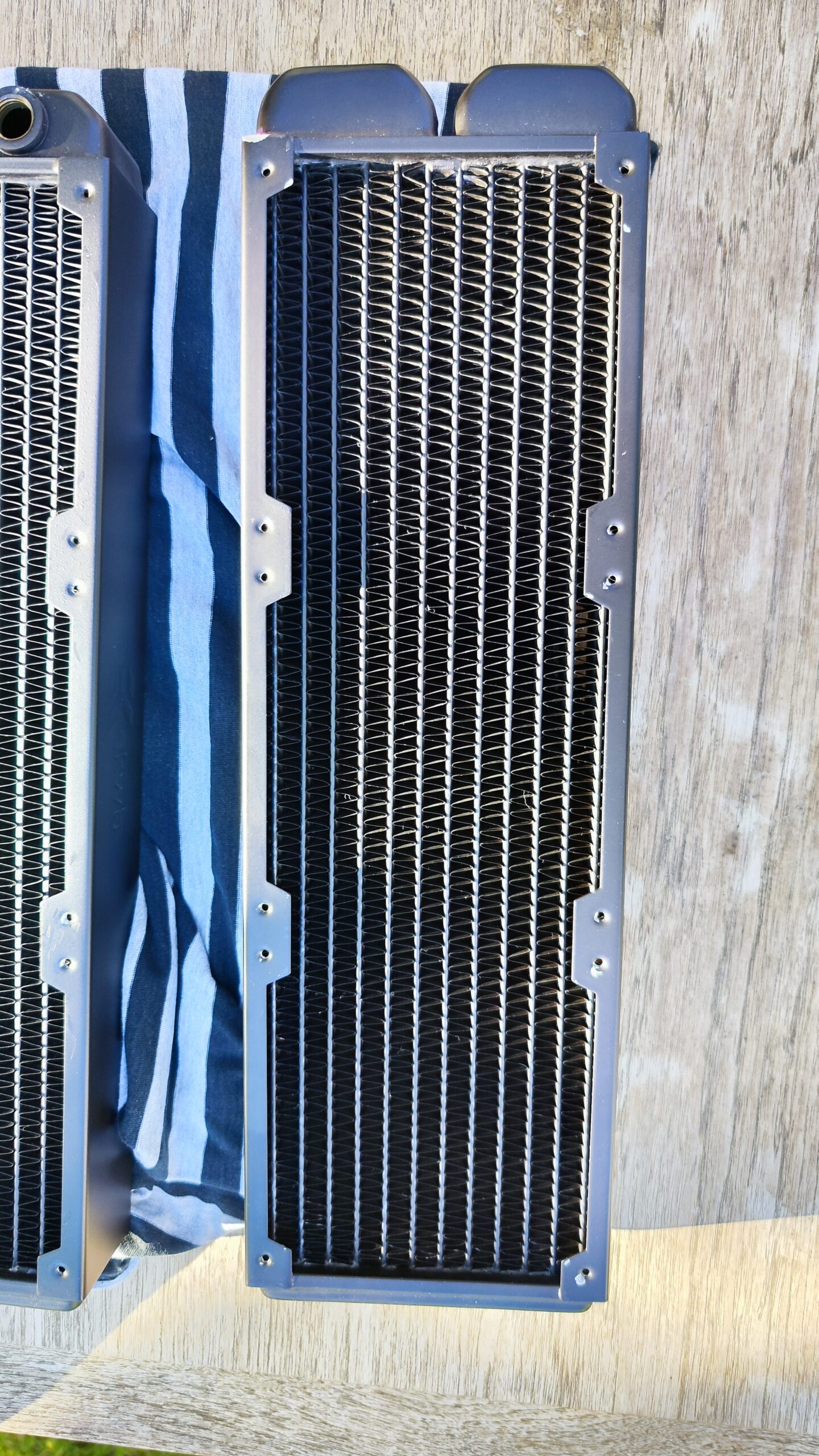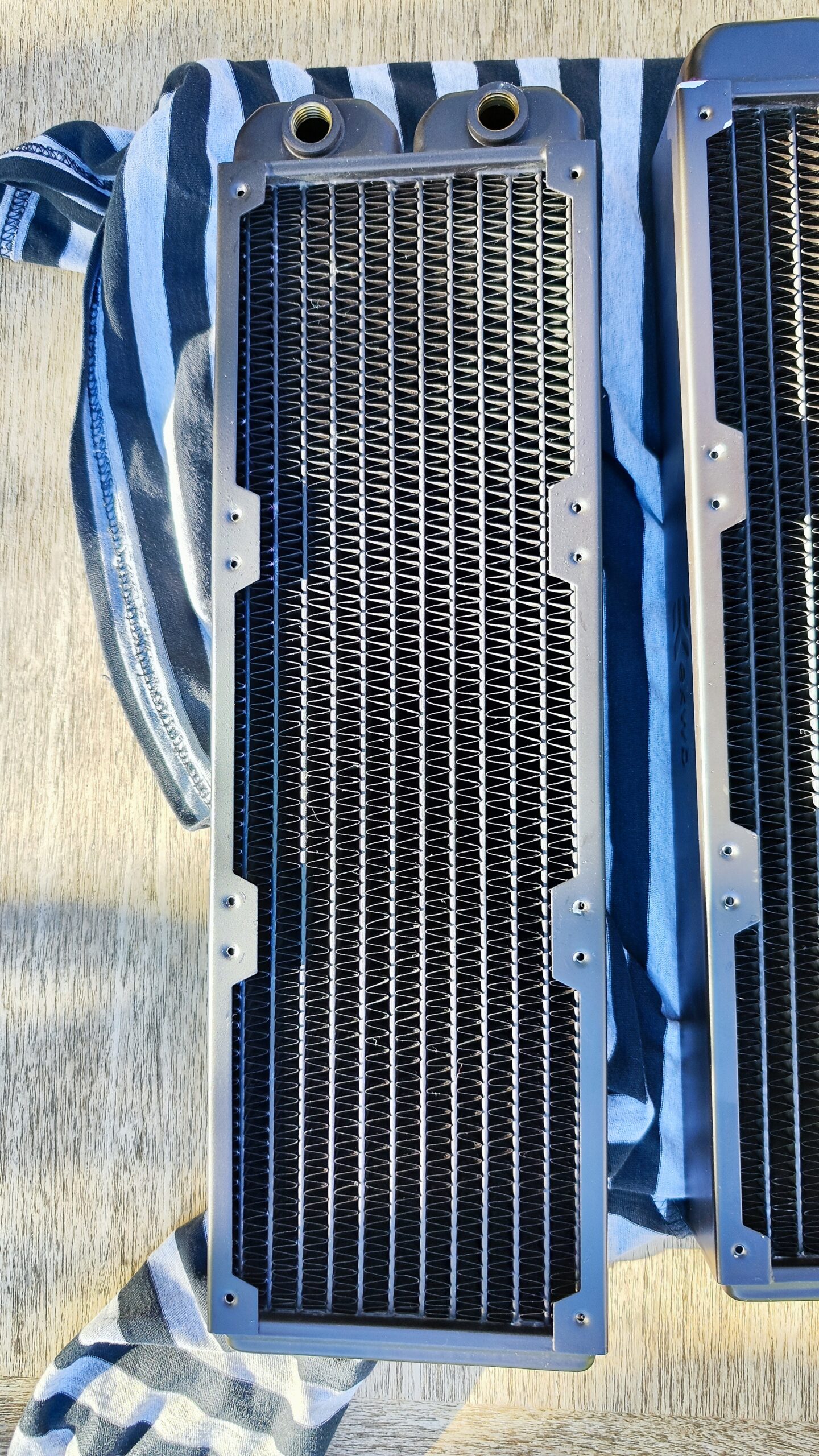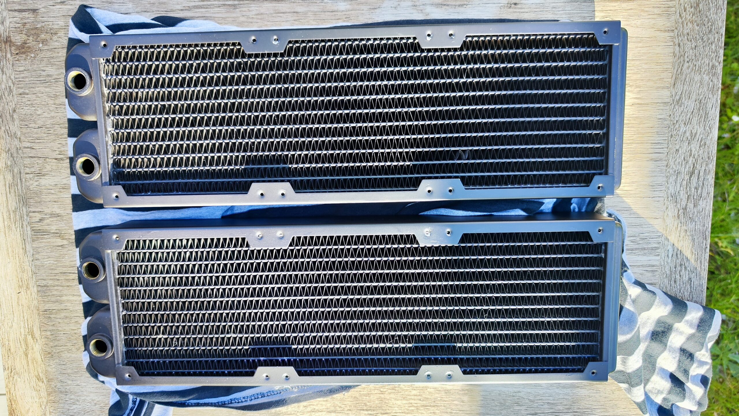 I övrigt är de i mycket fint skick, fullt fungerande, och jag skulle inte tveka en sekund att använda dem i nästa loop. De är riktigt tjocka och rejäla – jag körde push/pull-konfiguration på båda. I mitt senaste bygge (GTX 1080 / i5-10600K) var de kraftigt överdimensionerade. I princip hade jag fläktarna avstängda nästan hela tiden, utom vid spel – vätskans volym i loopen och passiv kylning via radiatorerna räckte gott och väl för vardagligt surfande, programmering och YouTube-tittande.