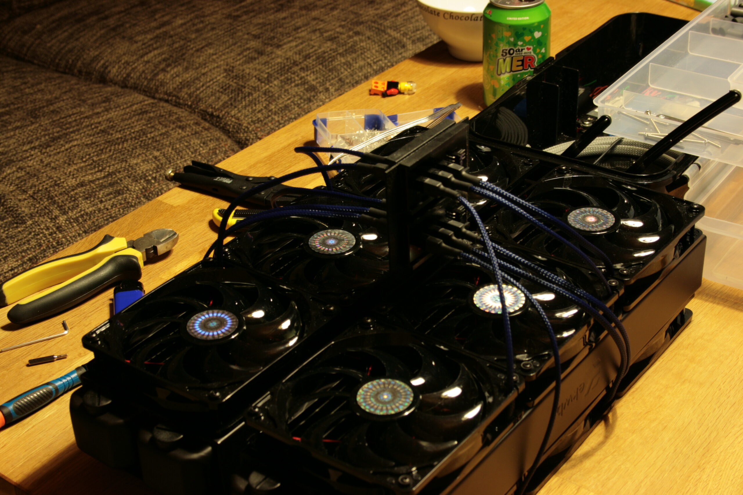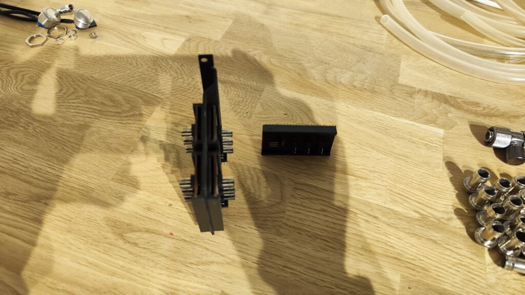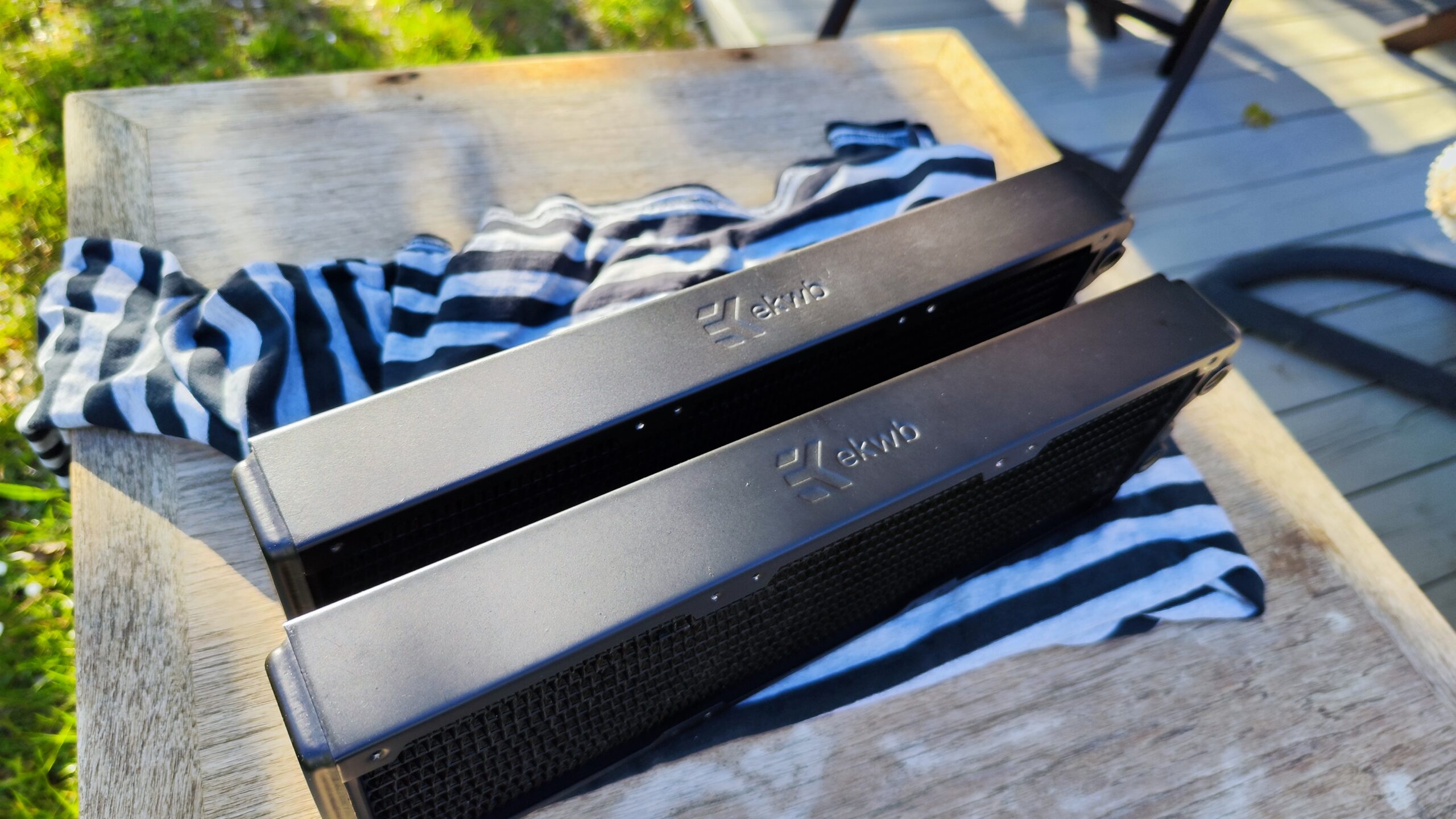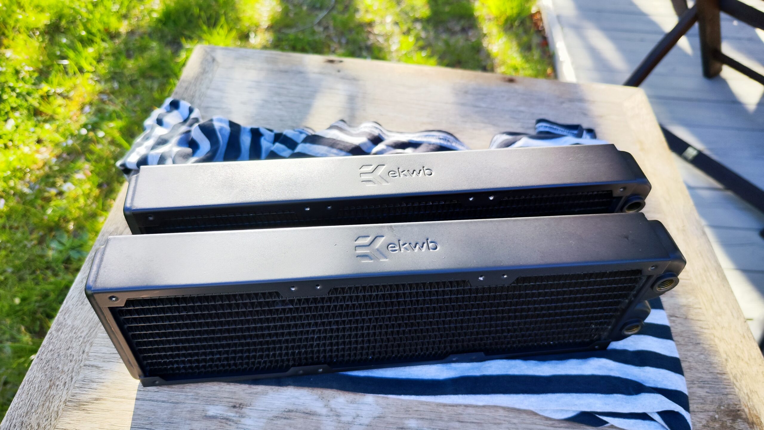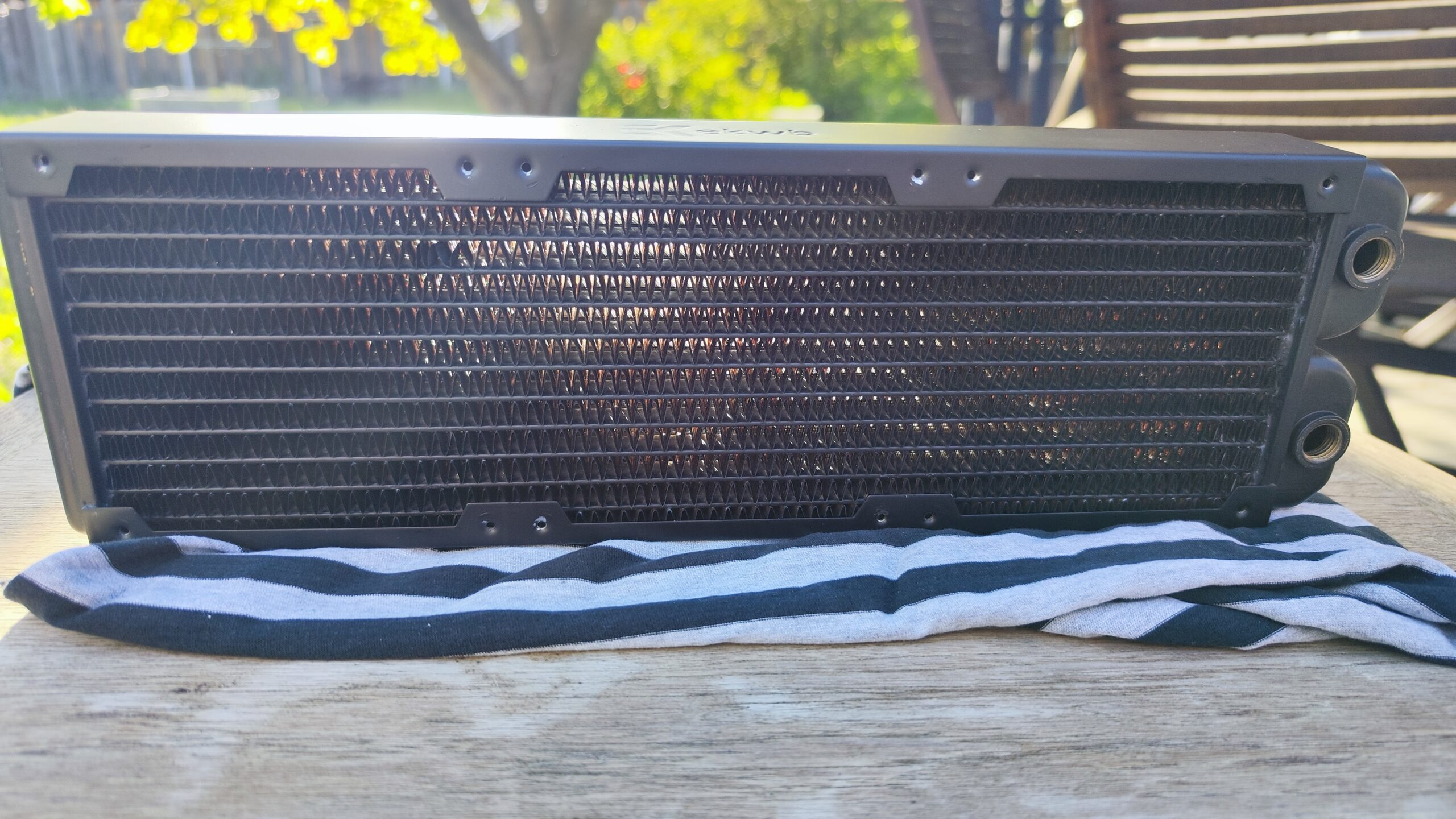 I övrigt är de i mycket fint skick, fullt fungerande, och jag skulle inte tveka en sekund att använda dem i nästa loop. De är riktigt tjocka och rejäla – jag körde push/pull-konfiguration på båda. I mitt senaste bygge (GTX 1080 / i5-10600K) var de kraftigt överdimensionerade. I princip hade jag fläktarna avstängda nästan hela tiden, utom vid spel – vätskans volym i loopen och passiv kylning via radiatorerna räckte gott och väl för vardagligt surfande, programmering och YouTube-tittande.