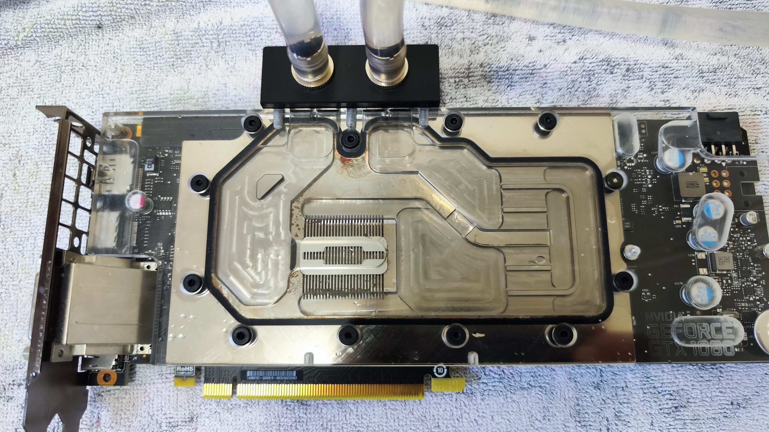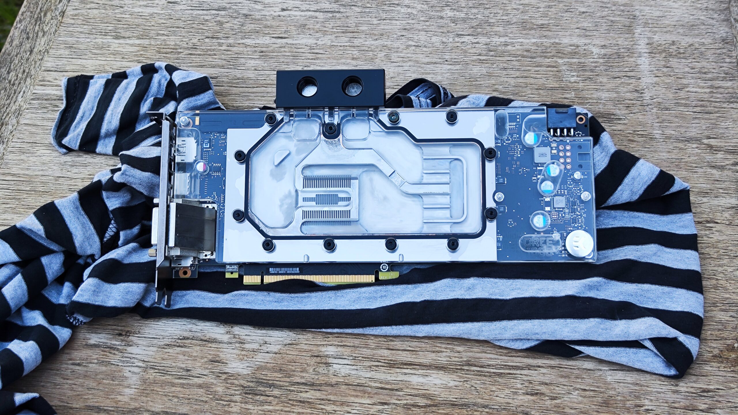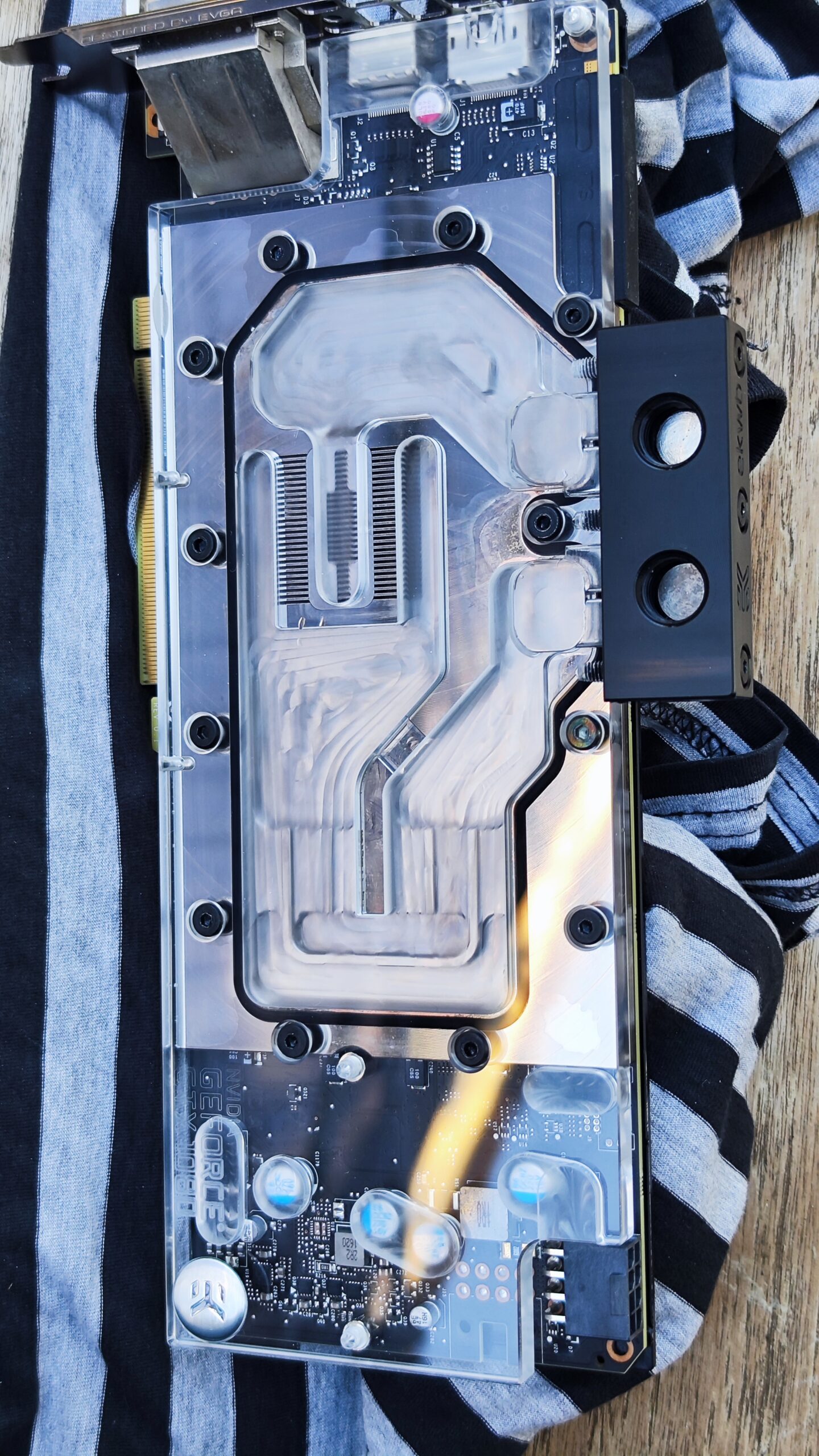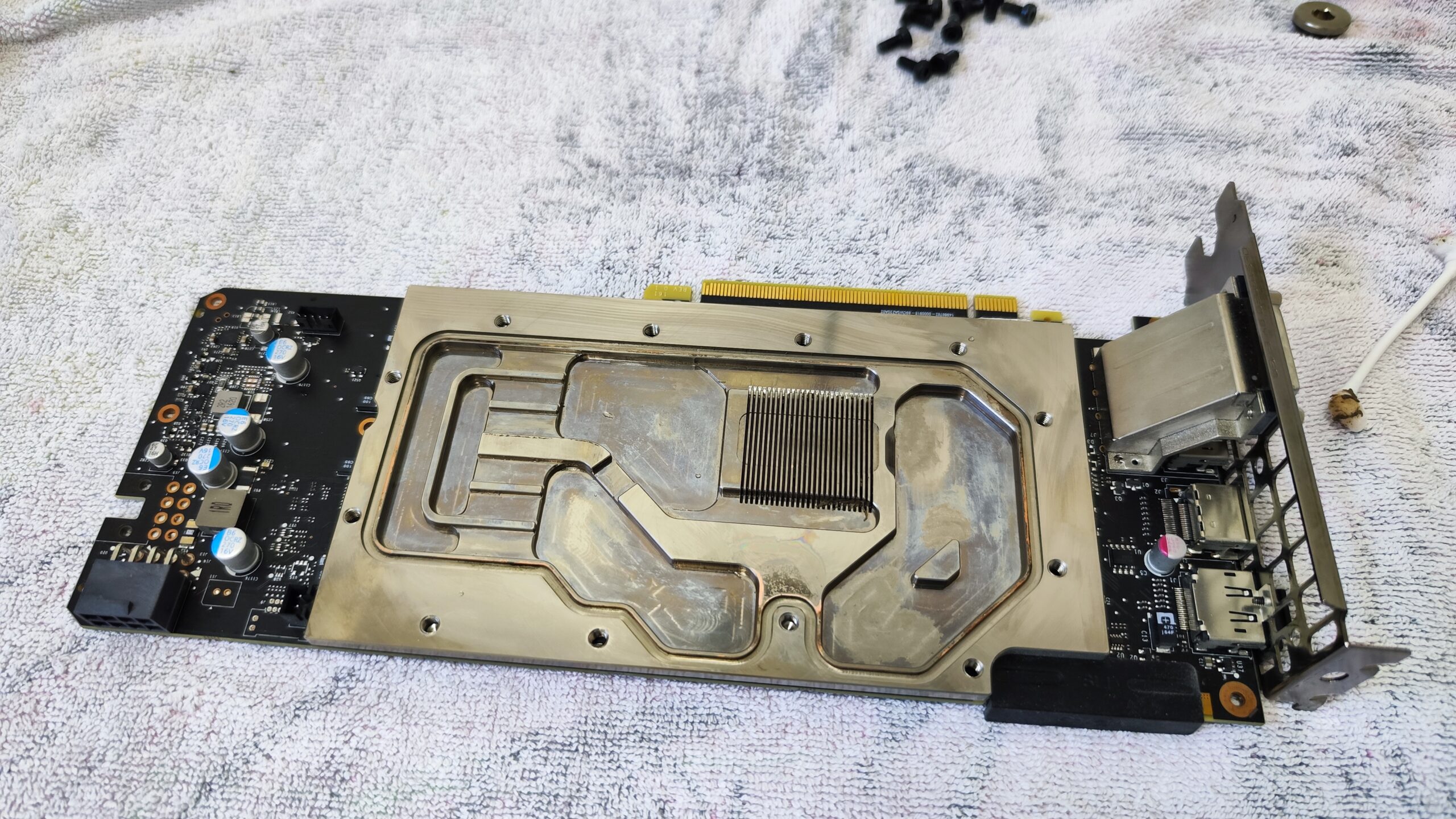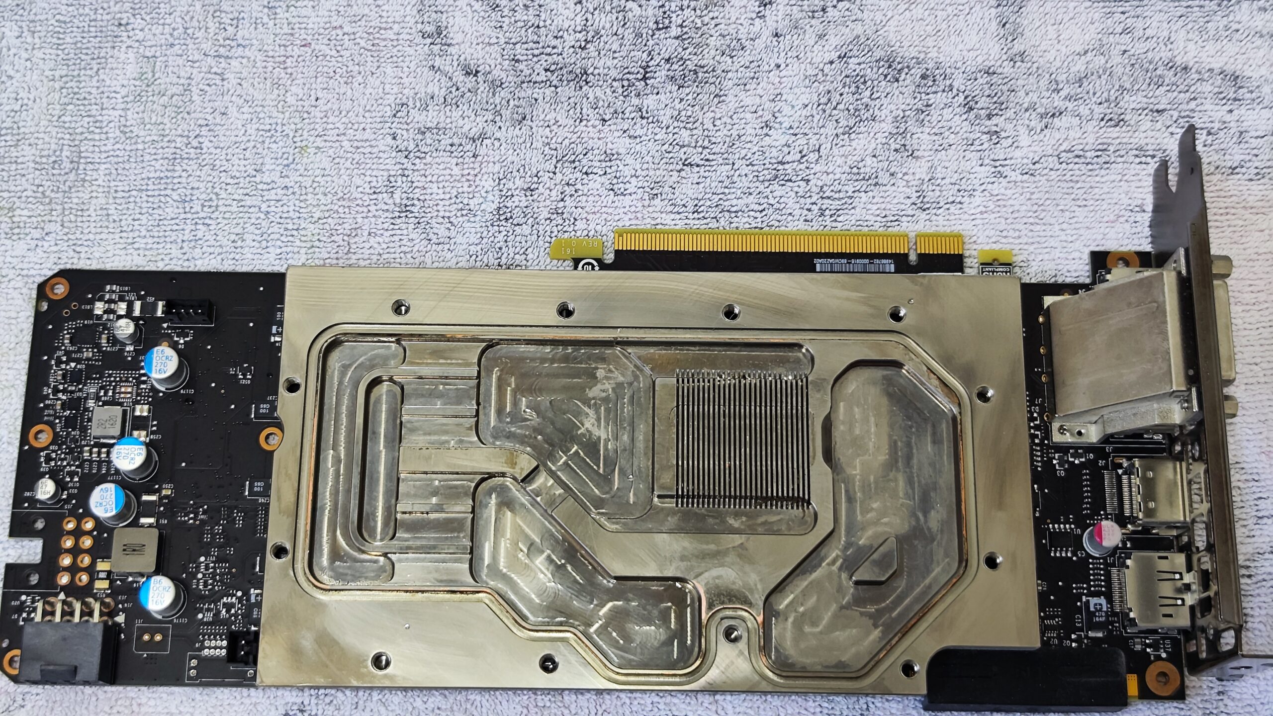 Precis som med CPU-blocket har nickelskiktet på kylaren delvis frätts bort. Det hände för flera år sedan och har inte spridit sig sedan dess. Kortet har fungerat utmärkt i praktisk drift, och skadan syns inte särskilt mycket när allt är monterat.