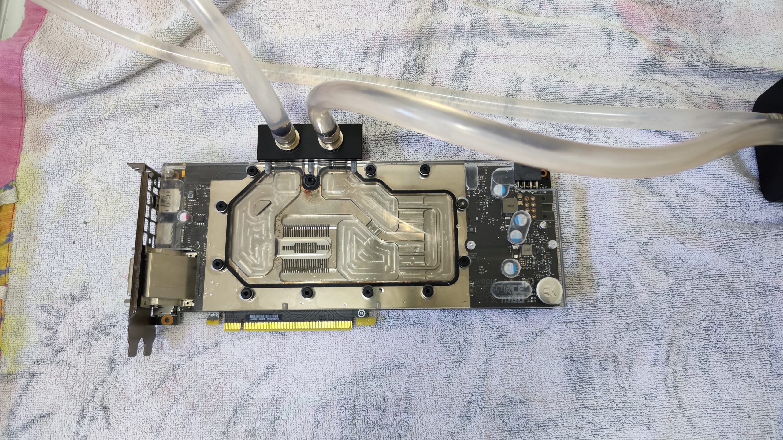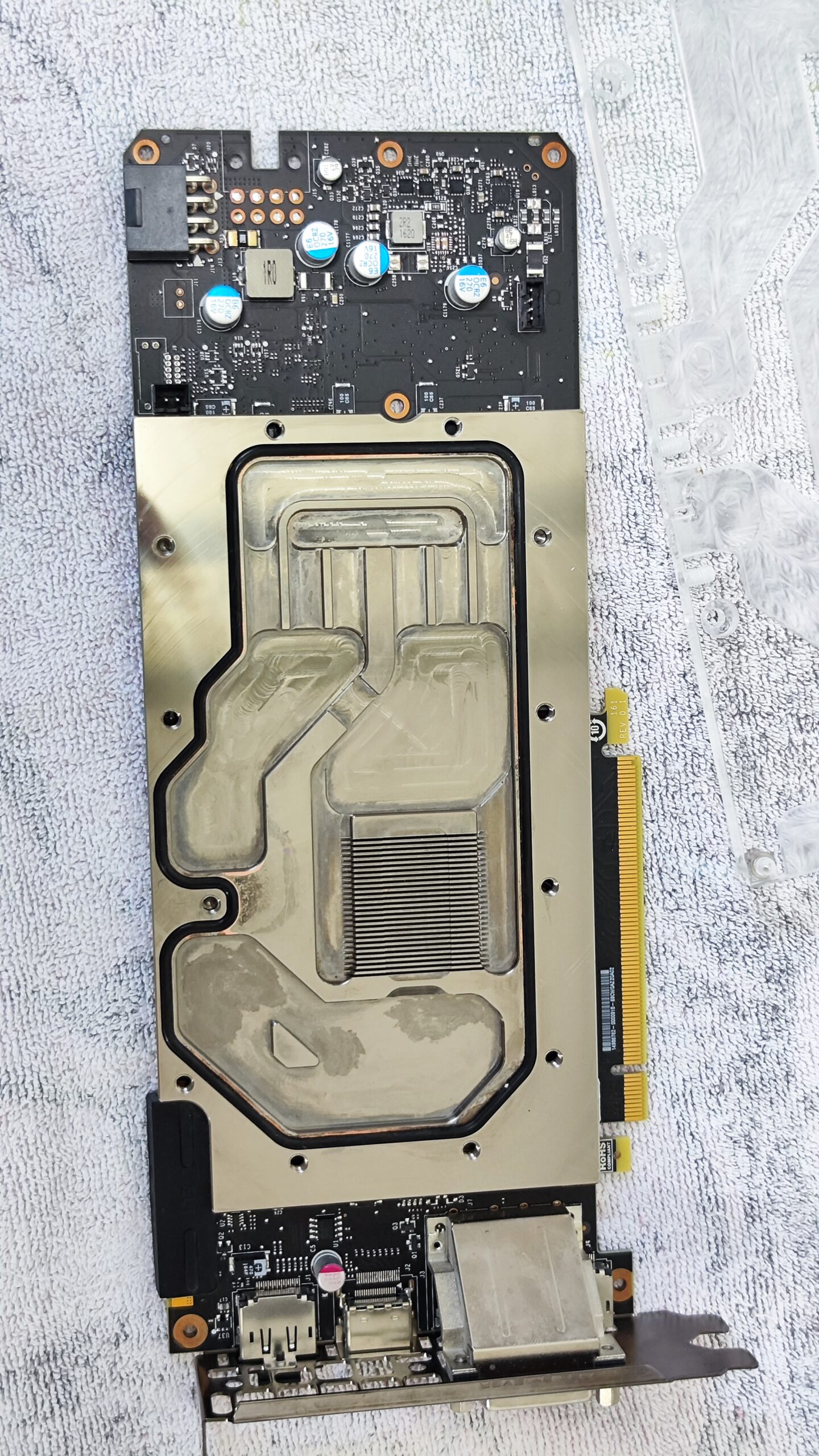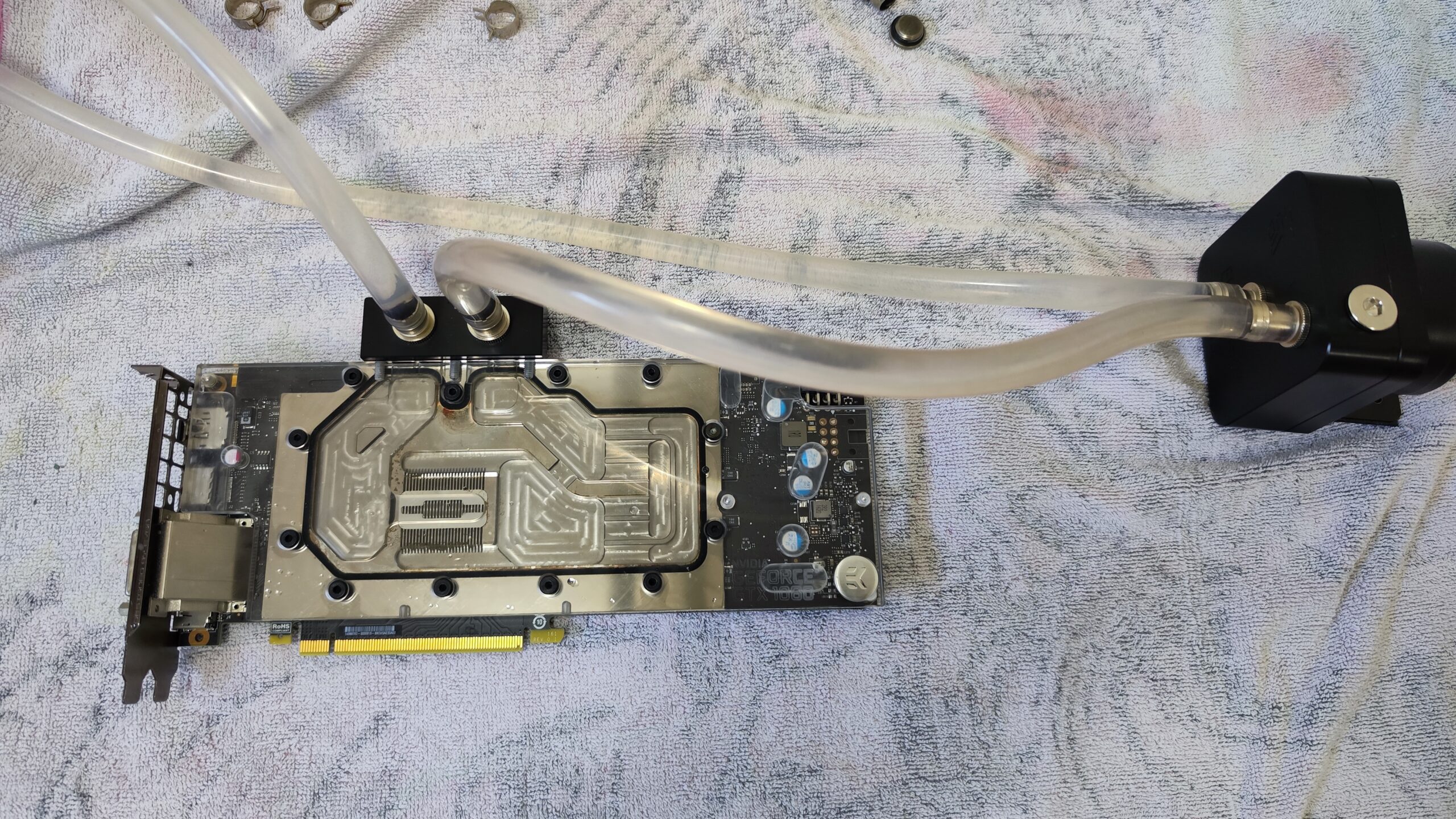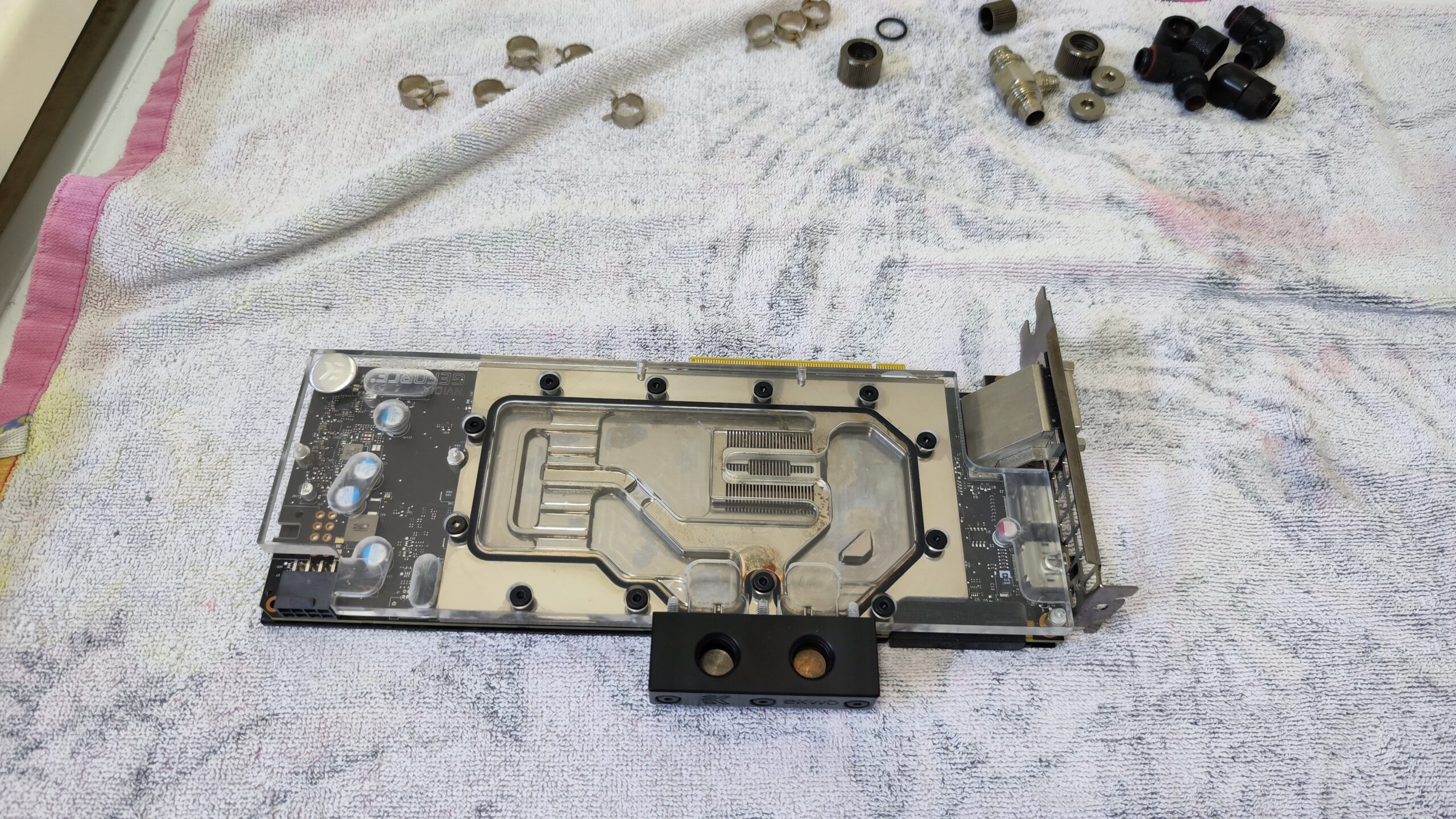 Precis som med CPU-blocket har nickelskiktet på kylaren delvis frätts bort. Det hände för flera år sedan och har inte spridit sig sedan dess. Kortet har fungerat utmärkt i praktisk drift, och skadan syns inte särskilt mycket när allt är monterat.