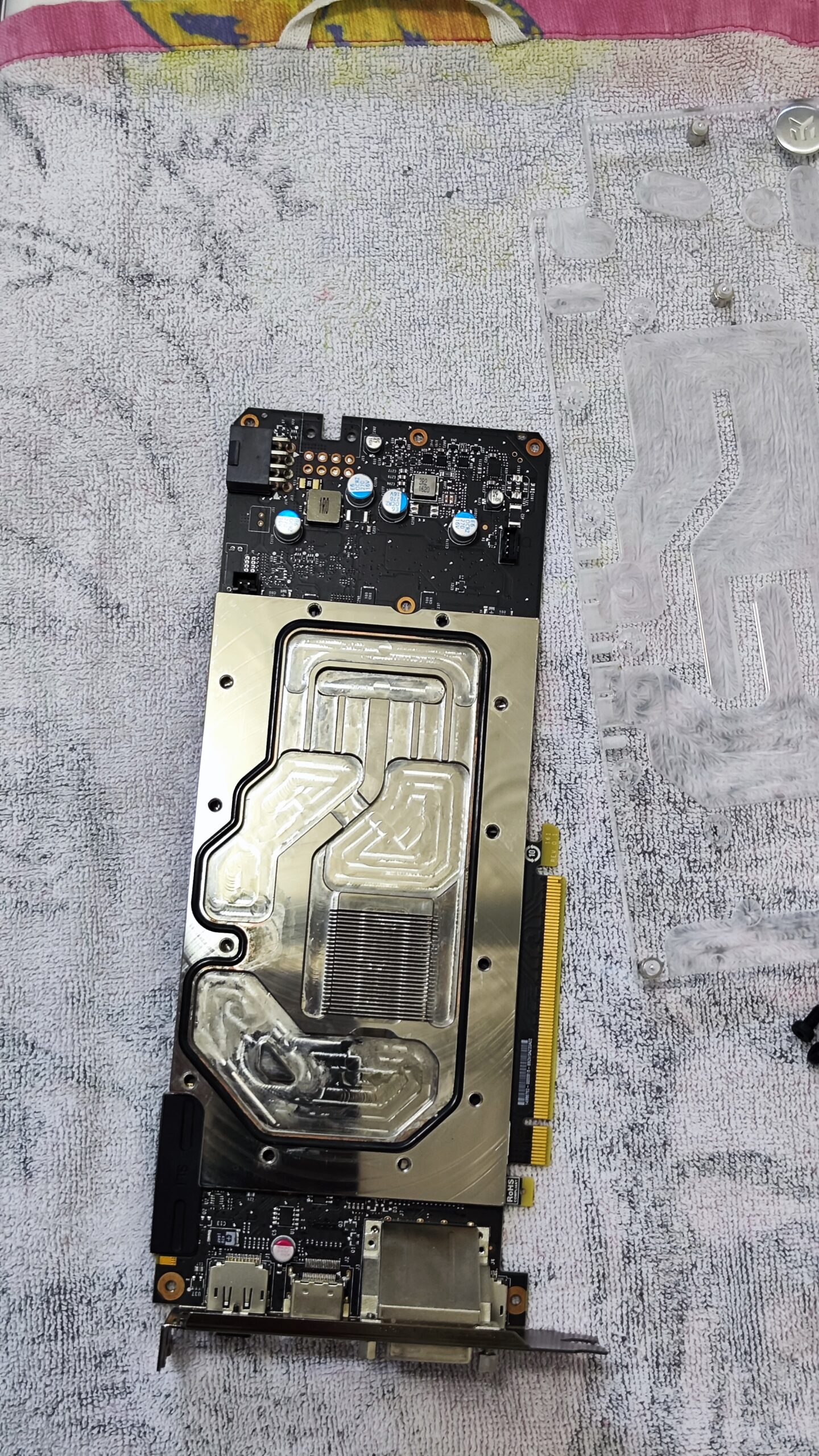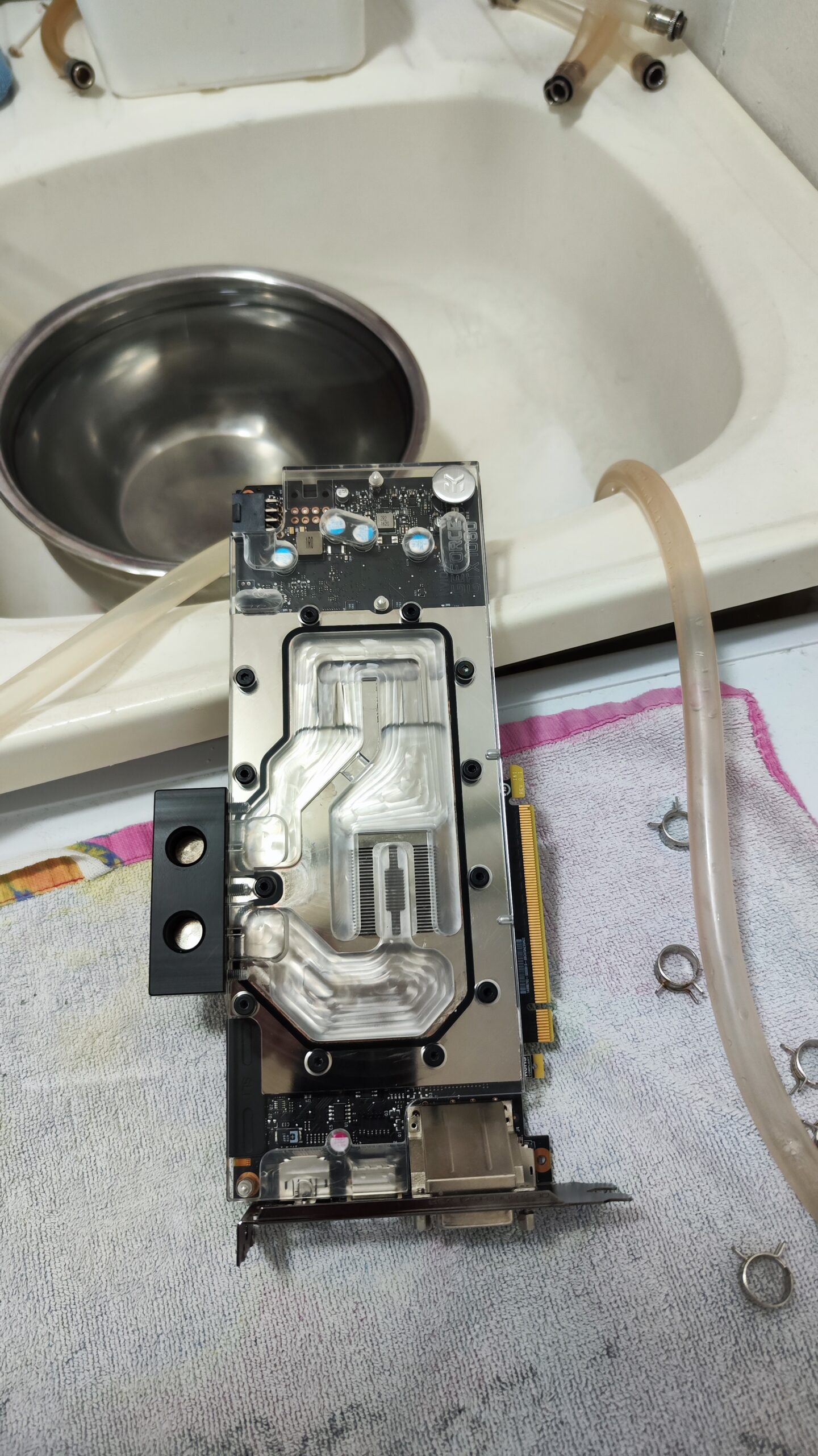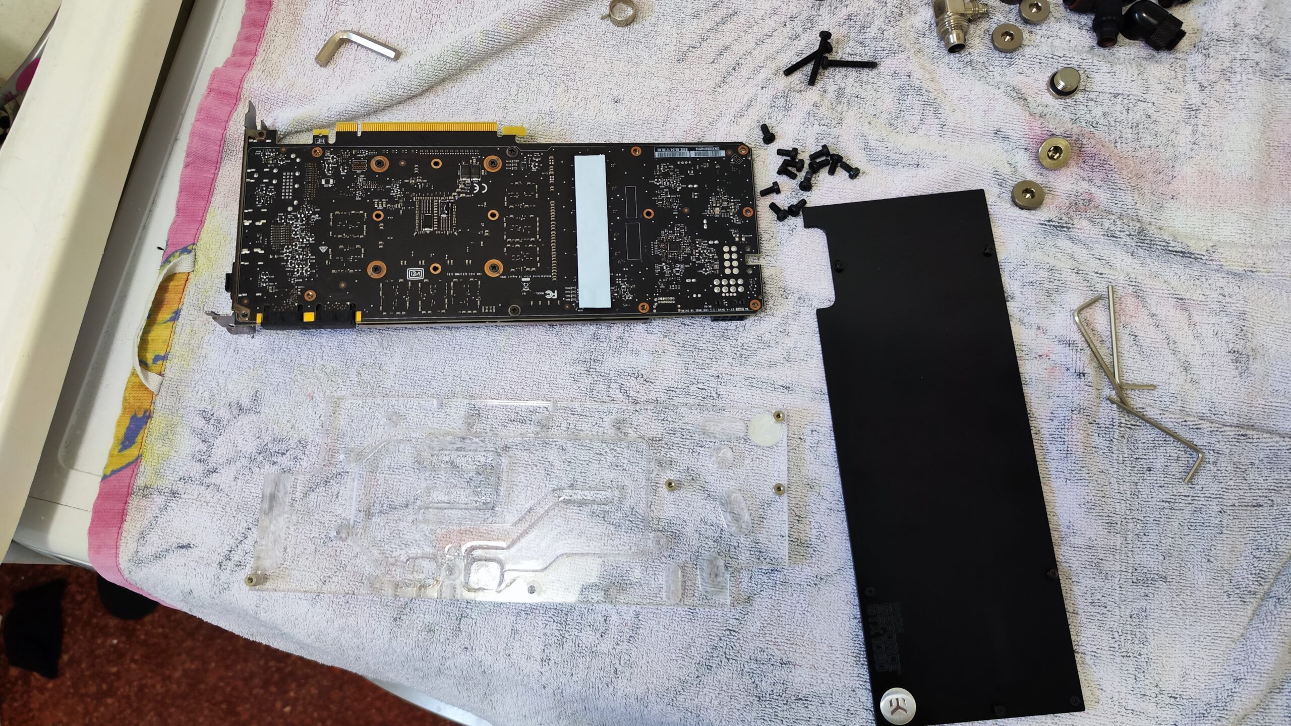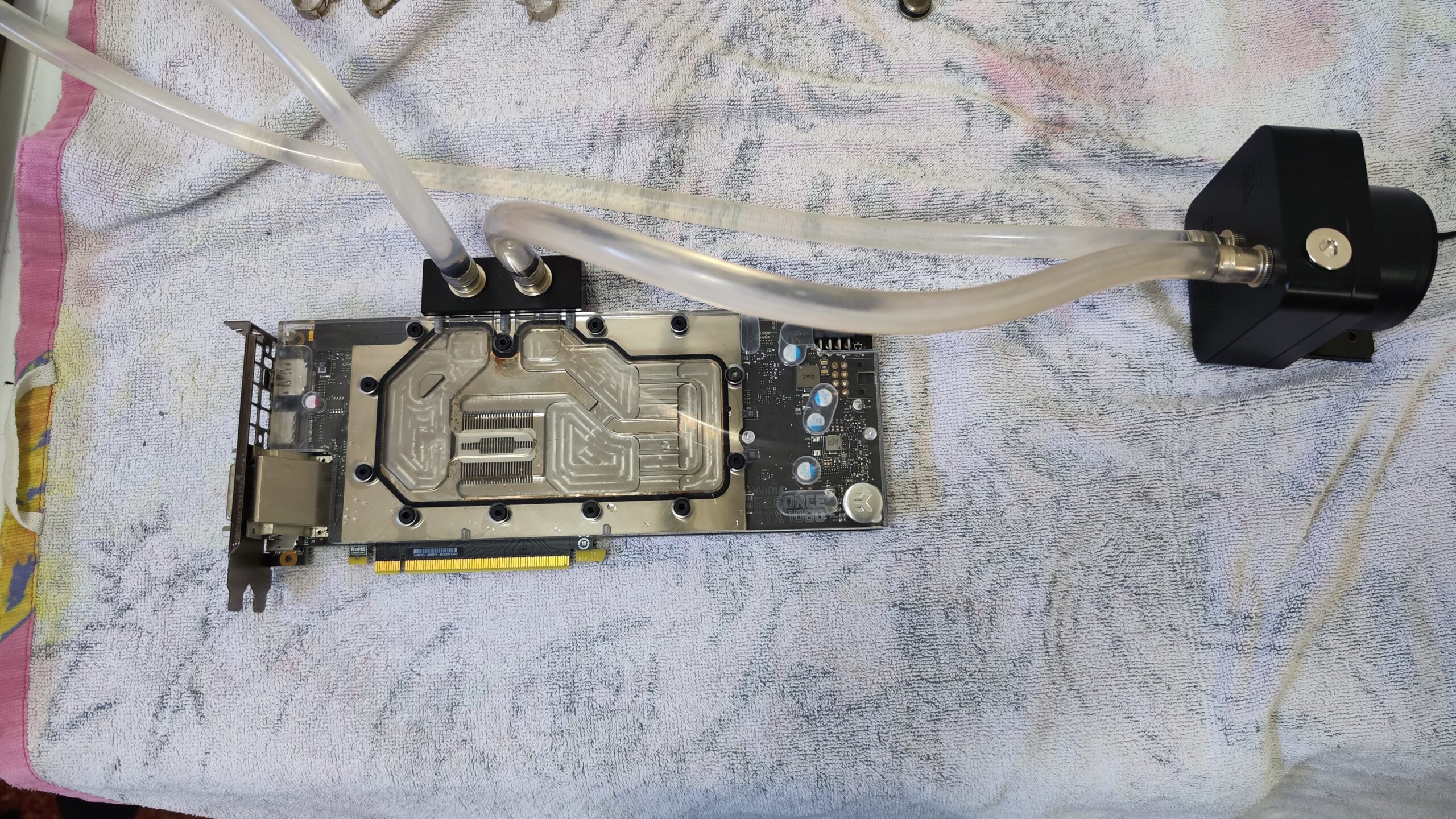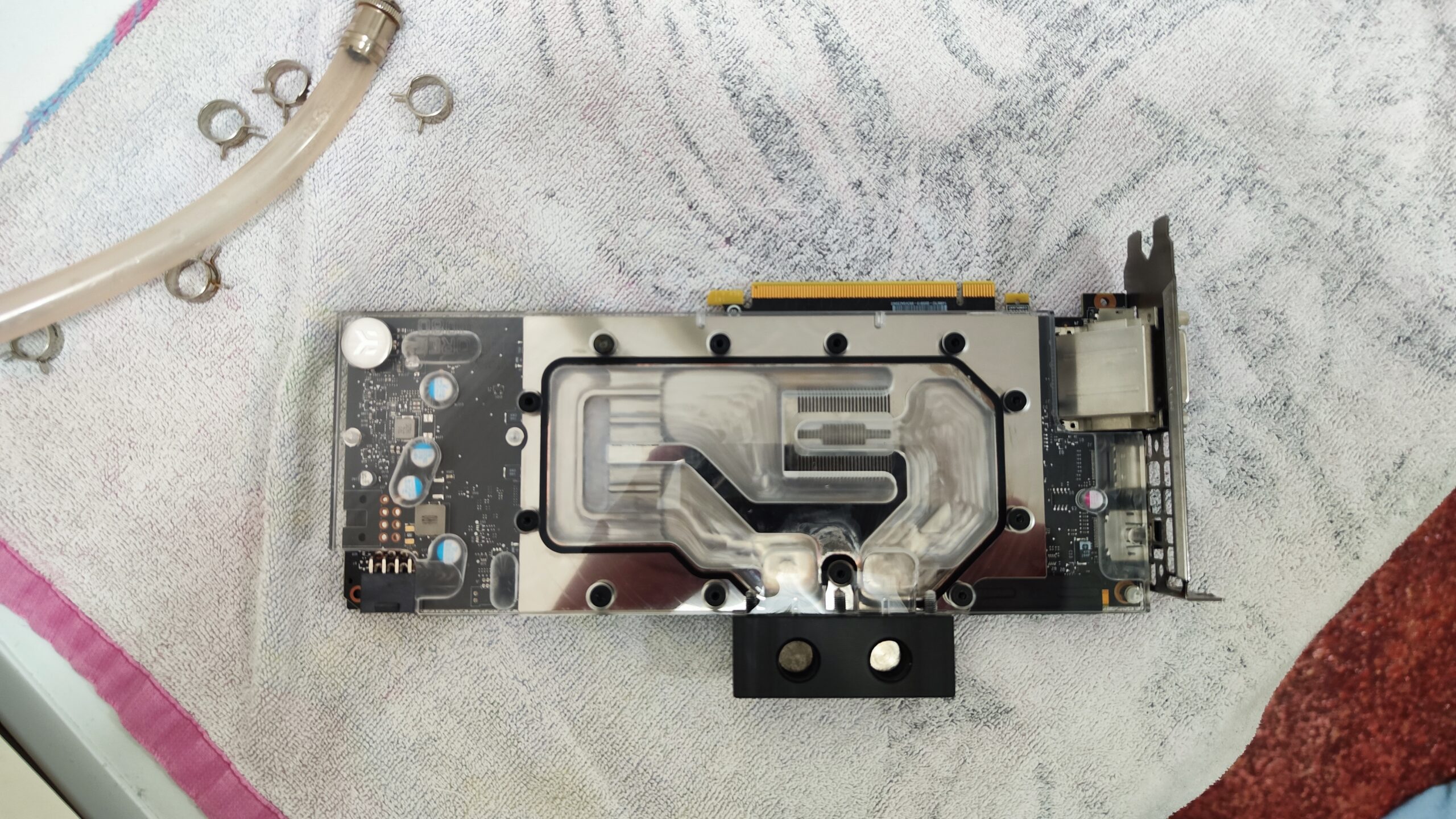 Precis som med CPU-blocket har nickelskiktet på kylaren delvis frätts bort. Det hände för flera år sedan och har inte spridit sig sedan dess. Kortet har fungerat utmärkt i praktisk drift, och skadan syns inte särskilt mycket när allt är monterat.