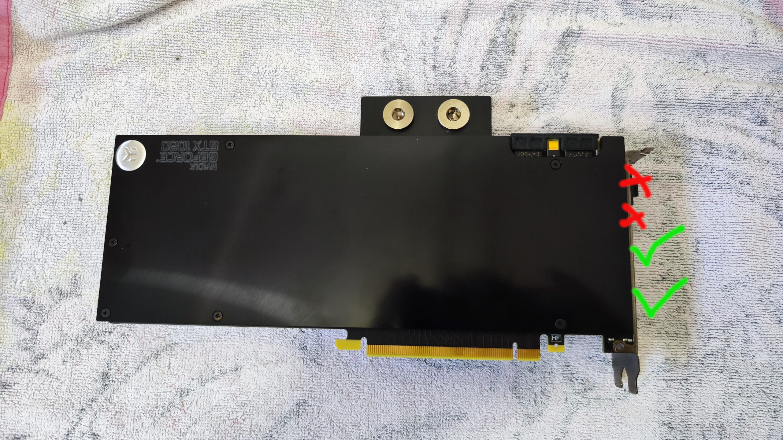 OBS: Kortet har två trasiga portar – en DisplayPort och en HDMI. Jag hade en HDMI-kabel liggande på golvet som jag snubblade över, och antagligen var både HDMI- och DisplayPort-porten kopplade till samma krets som då kortslöts/gick sönder. De övriga två DisplayPort-portarna finns kvar och fungerar utan problem.