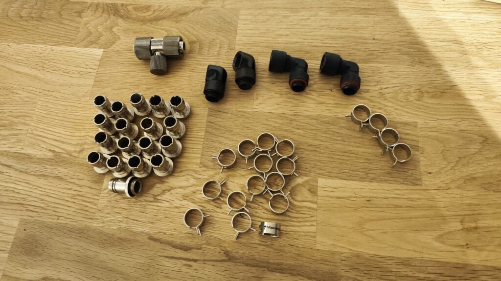 Kopplingar för mjukslang samt slangklämmor Vissa klämmor har förvarats fel och fått lite ytrost. Kanske inget man vill använda i ett nytt bygge, men de funkar bra för t.ex. spolning/test.